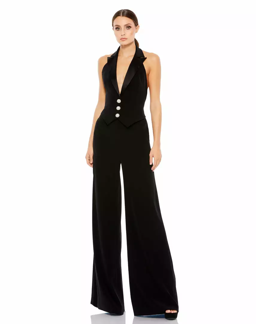 Sexy tuxedo-style jumpsuit with a plunging halter neckline and rhinestone brooch buttons.