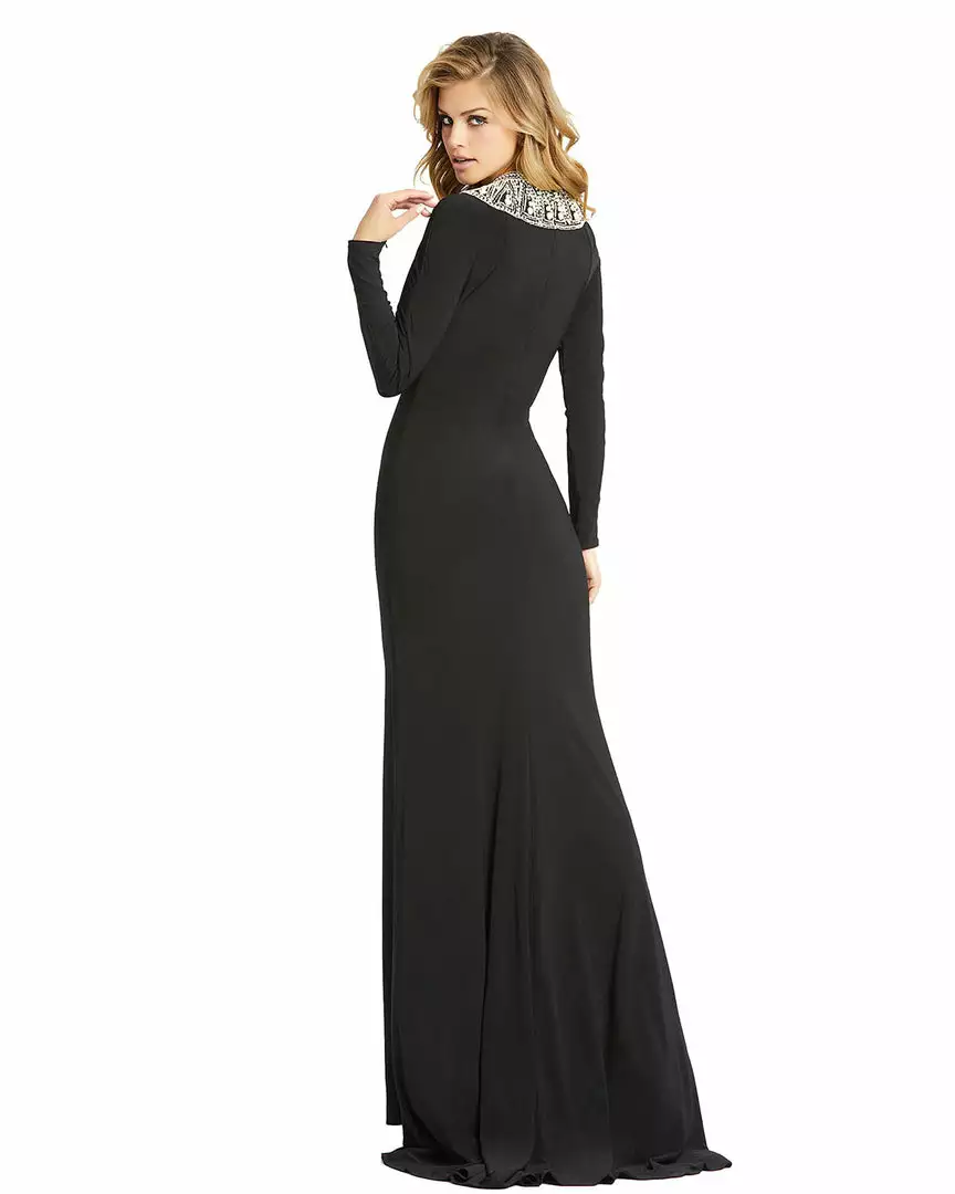 Full-length jersey gown with sequins, beading, and rhinestones lining the collar.