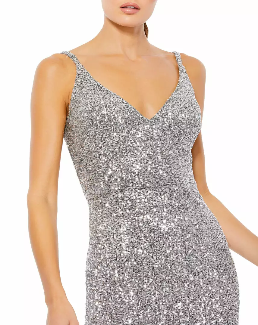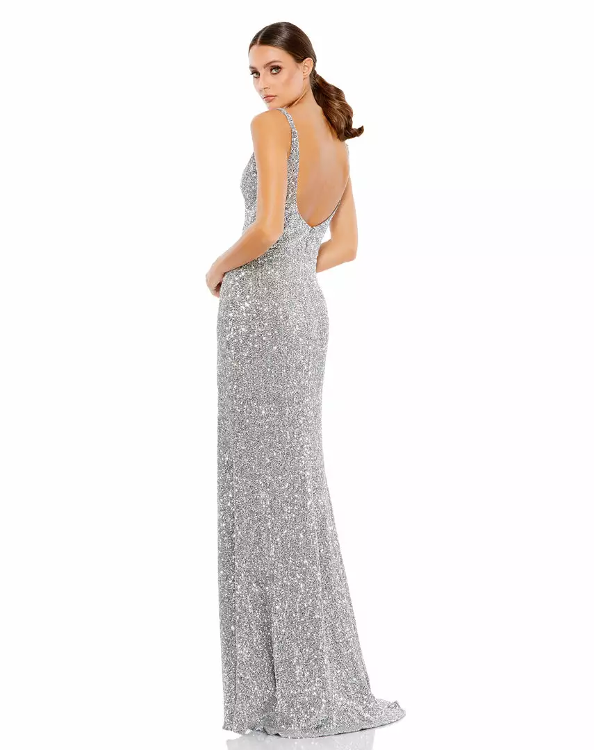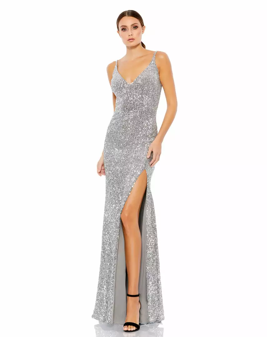 Sexy fully embellished sequin metallic gown finished with a thigh-high slit.