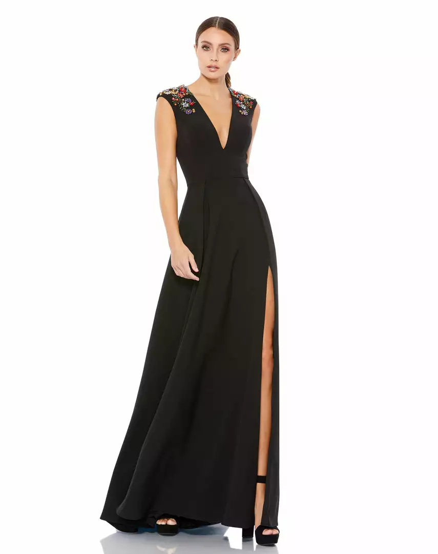 Elegant A-line gown accented with a plunging neckline and intricate bead-and-rhinestone floral accents across the shoulders and upper back.