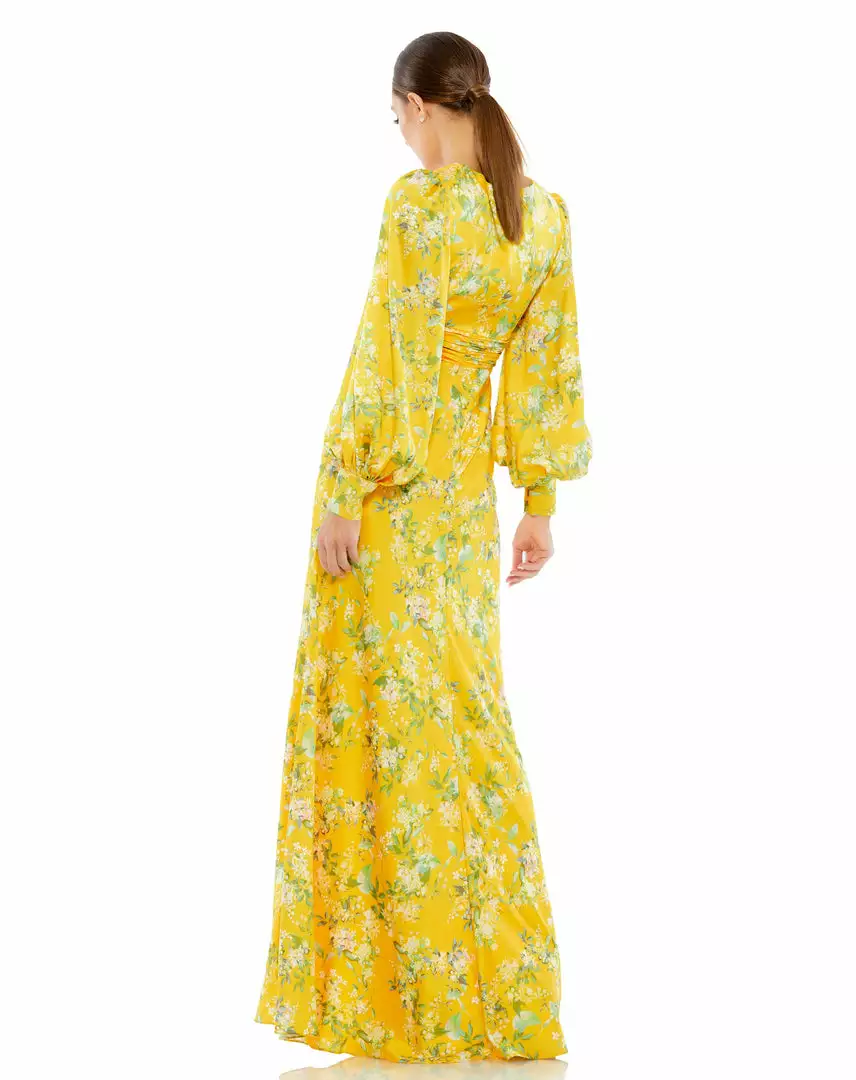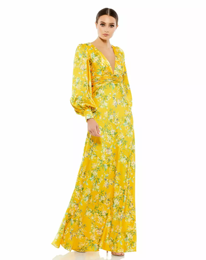Ieena For Mac Duggal Floral Bishop Long Sleeve V Neck Gown Shop For