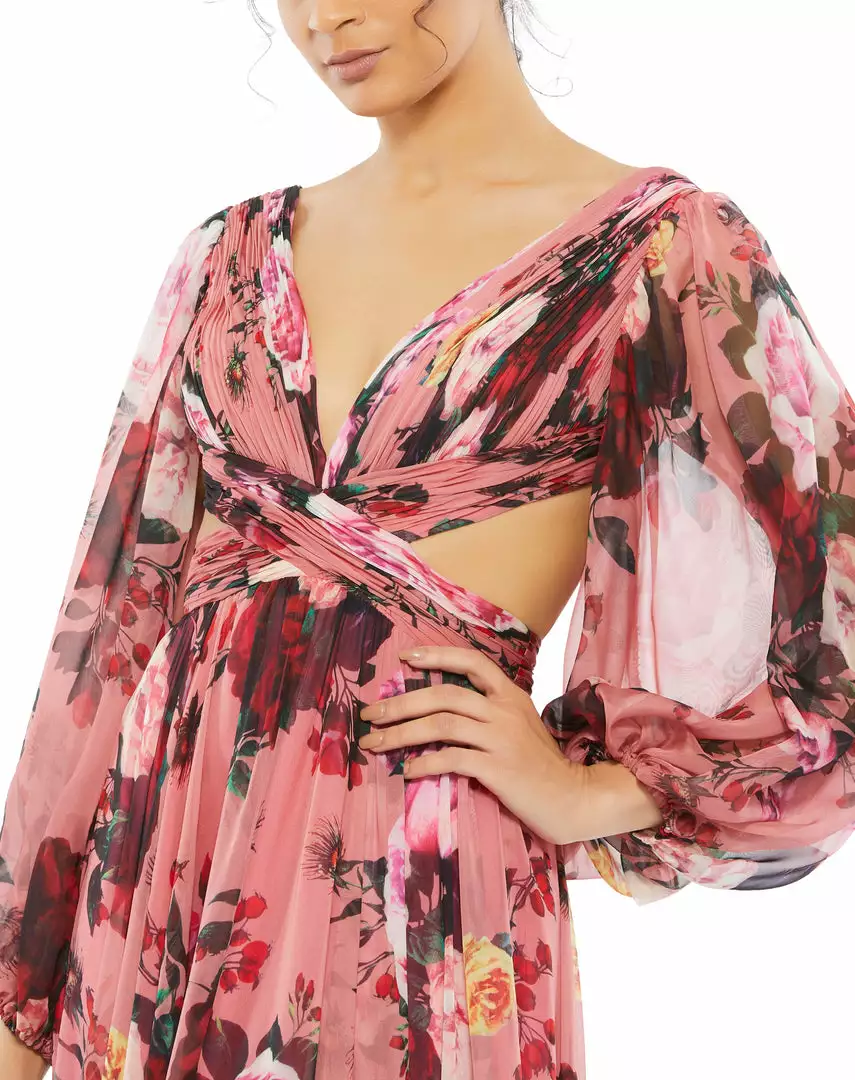 This ethereal floral dress features a pleated bodice with a plunging v-neckline, sexy side cutouts, and an exposed lace-up back. Sheer blouson sleeves are complimented by a flowy tiered floor-length skirt.