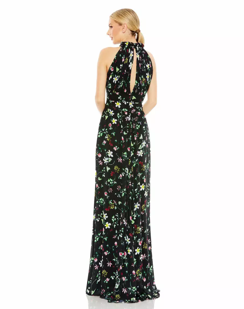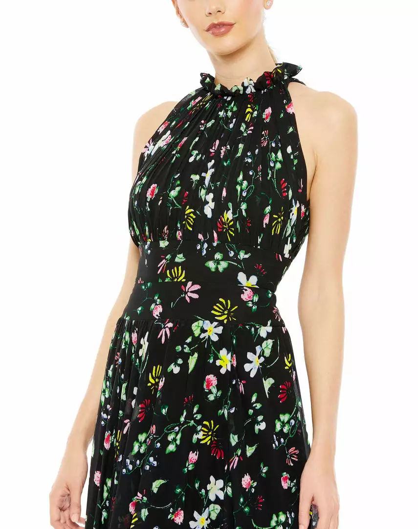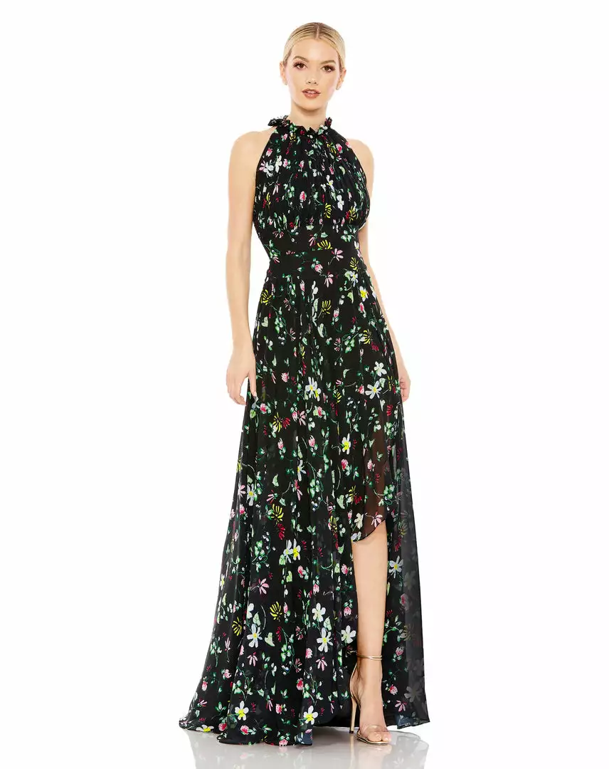 Need a dress for a garden gala or summertime wedding? We’ve got you covered with a style that’s elegant, stylish, and unique. Made from floral-print chiffon, this occasion dress is styled with a high, ruffled collar, cutaway shoulders, and gathered bodice before it finishes with a flowy, high-low skirt. A slender cutout at the back gives the halter dress a breezy finish.