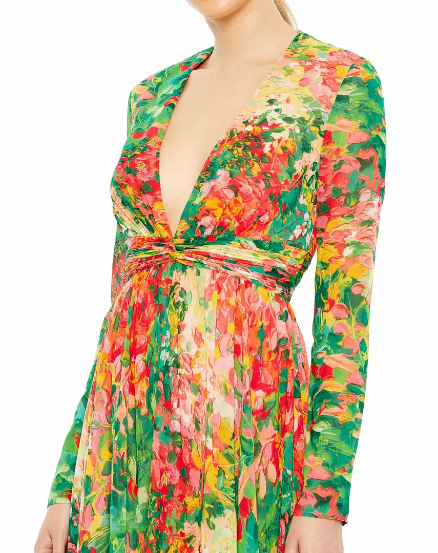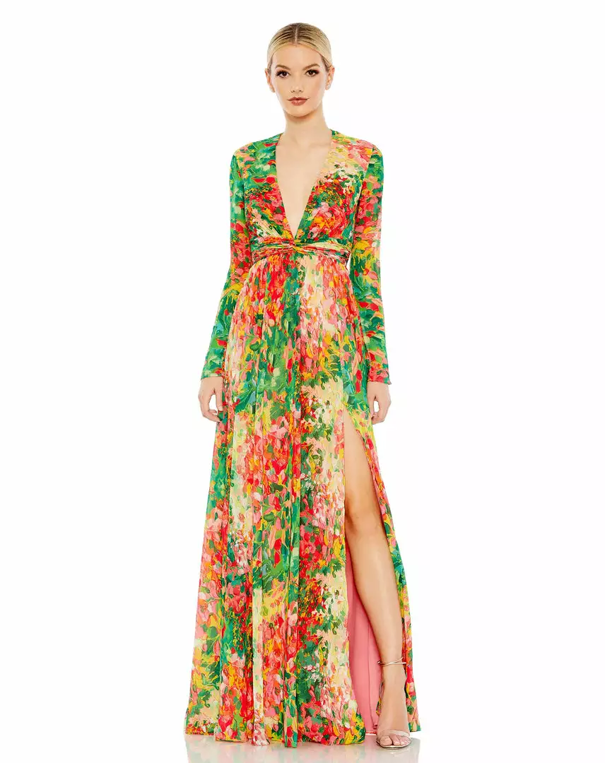 Inspired by impressionist art, this painterly-print maxi dress is one of our favorite styles for summer’s outdoor events. Styled with a deep neckline and fitted long sleeves, the dress is styled with a waist twist, high slit, and pleat detailing.