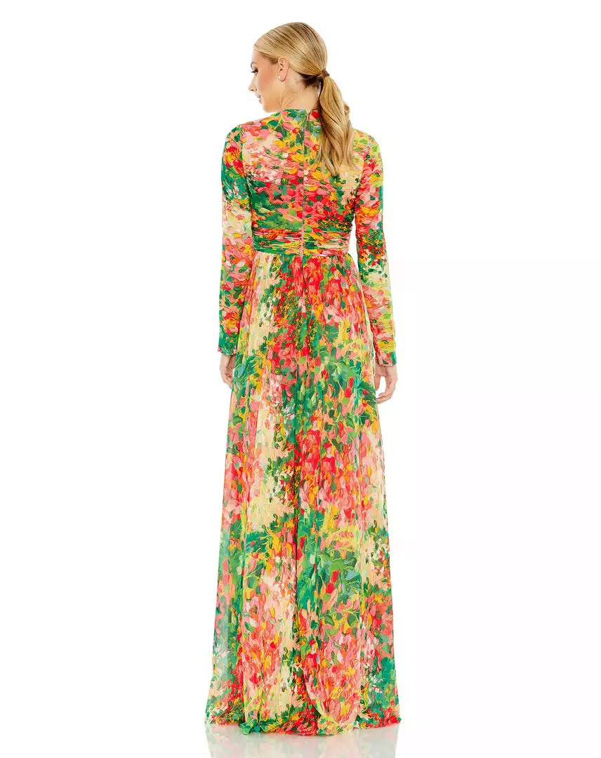 Ieena For Mac Duggal Floral Print Front Twist V Neck Long Sleeve Gown