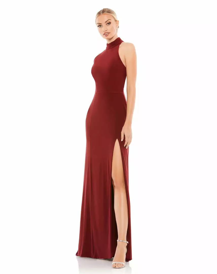 Elegant jersey gown featuring a front slit, teardrop-shaped back cutout, and puddle train.
