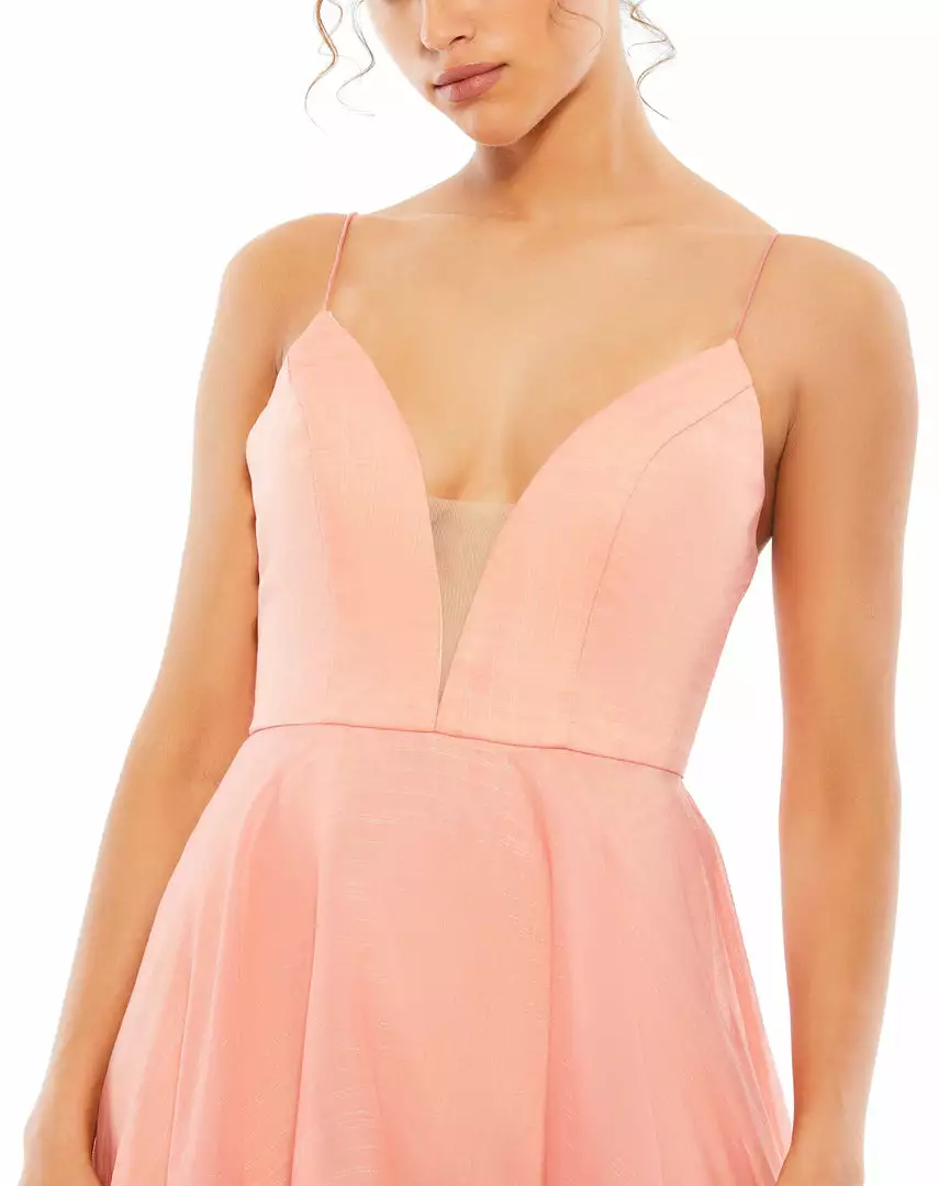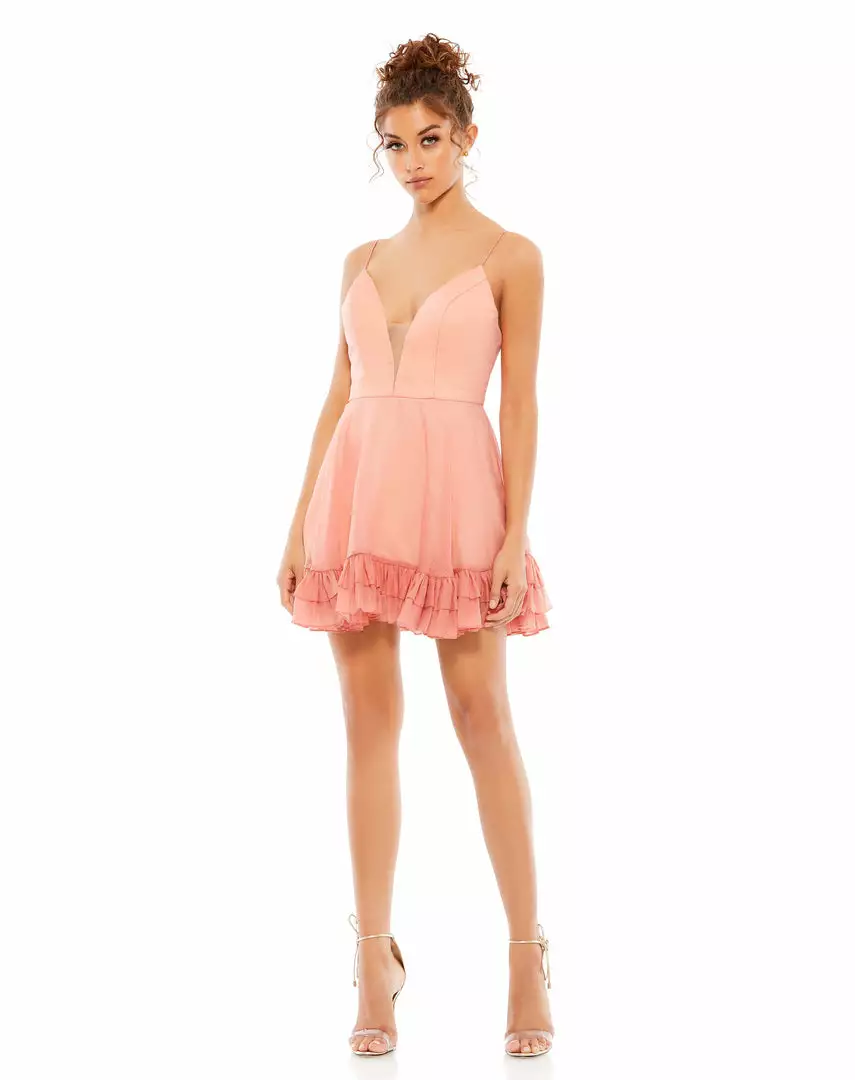 Iridescent chiffon fit-and-flare dress with a delicate ruffle detailing at the hem and a plunging neckline with sheer mesh insert.