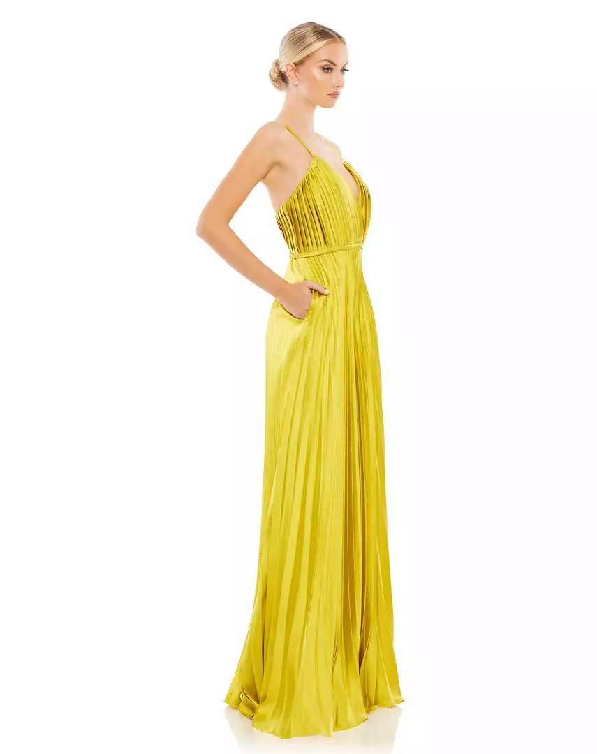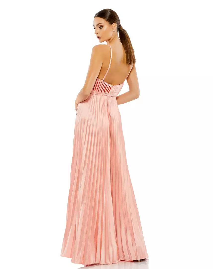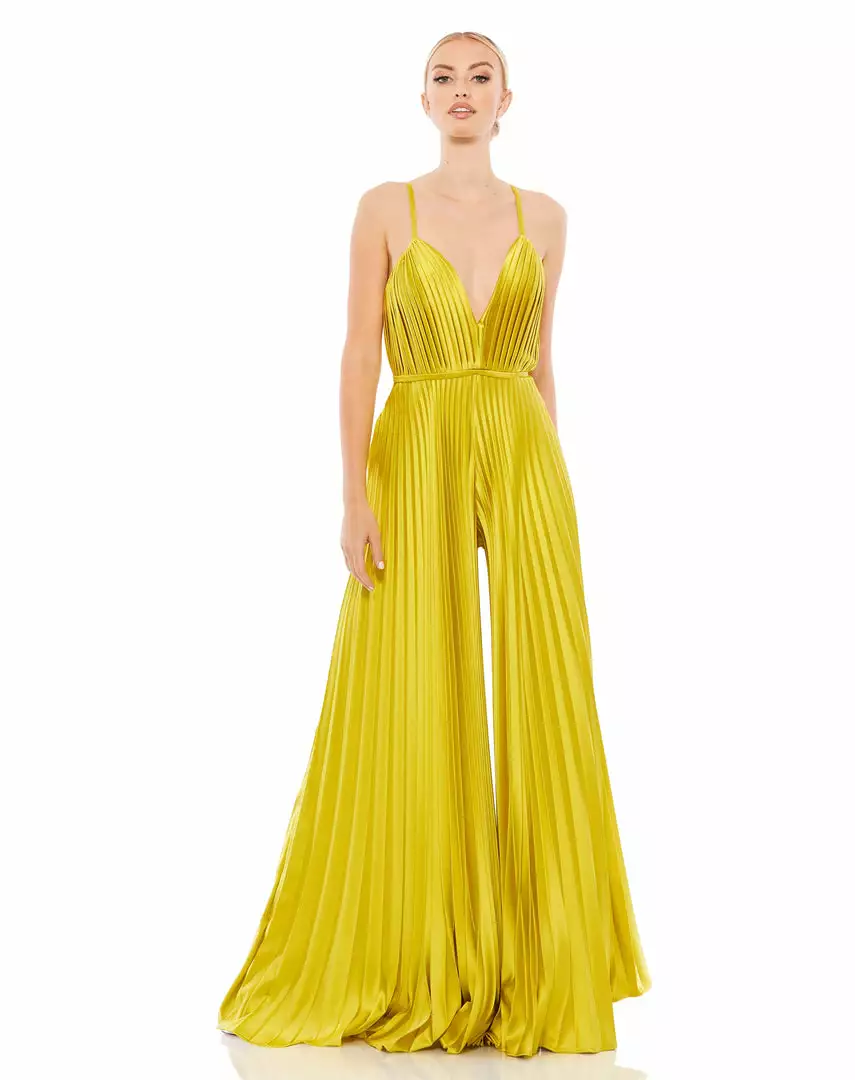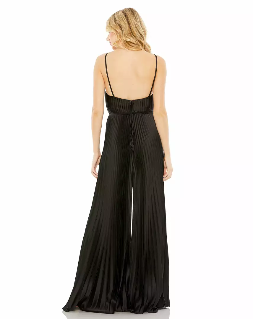 Fully-pleated wide leg jumpsuit in a beautiful silky charmeuse fabric and functional pockets.