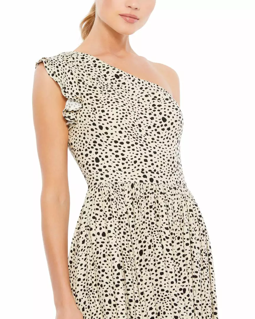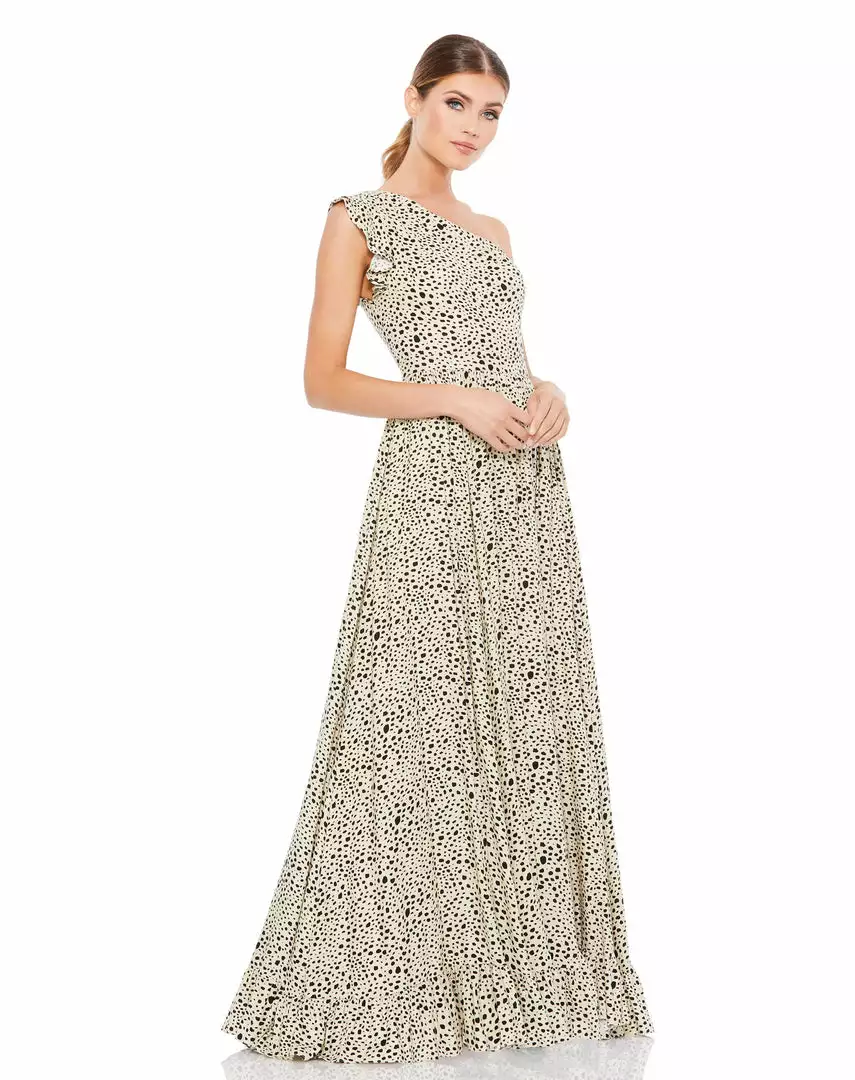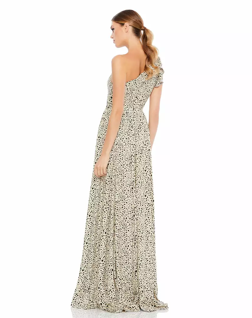 One-shoulder ruched animal print gown with a single flutter sleeve and a flowing, floor-length skirt.