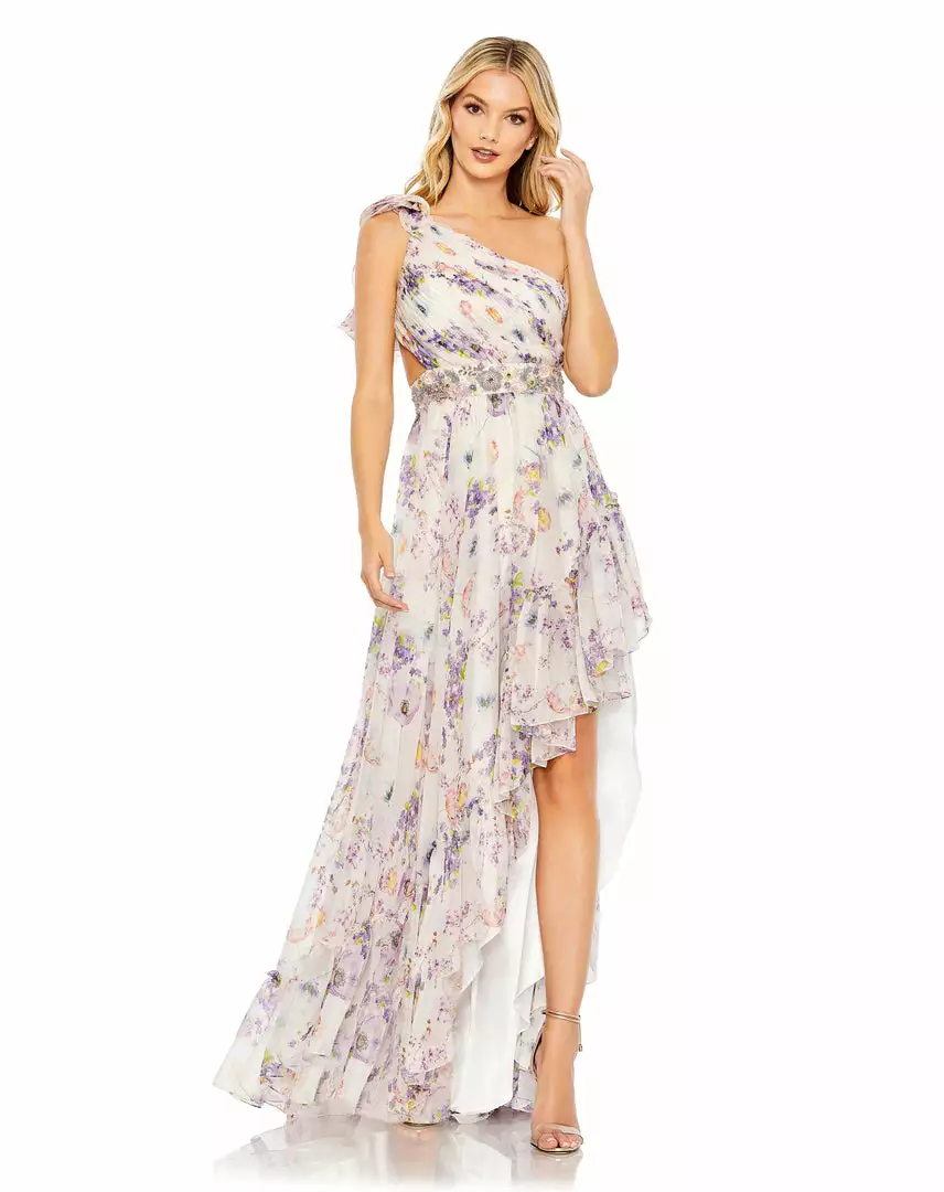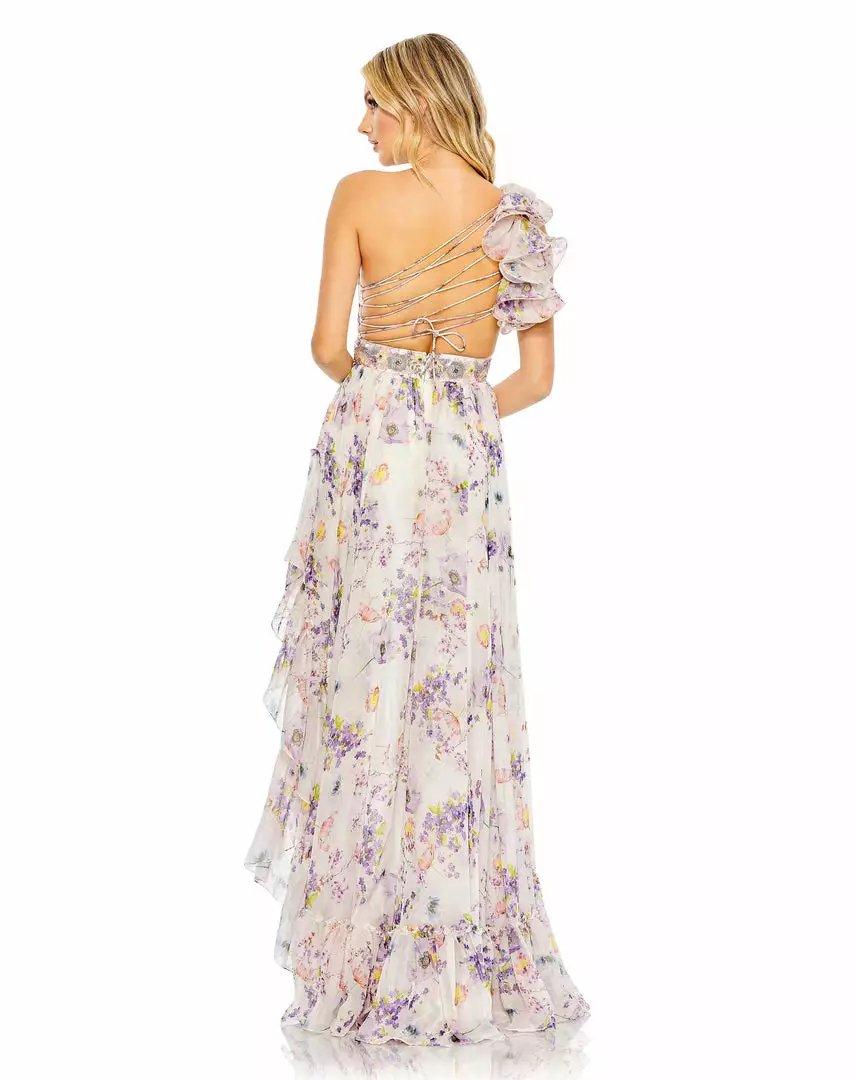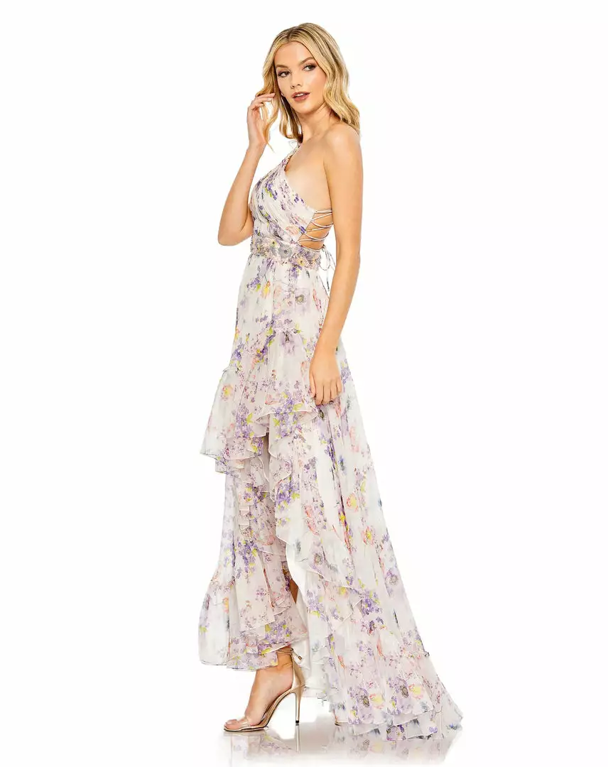 An elevated take on garden party dressing, this enchanting gown ticks all the boxes: romantic floral-print chiffon. Pretty pleating. A wire-edged, sculpted ruffle. Beautiful jeweled waist. The perfect blend of sweet and sexy, the dress is cut with ruffled, asymmetrical hem and finished with a strappy, skin-baring back.