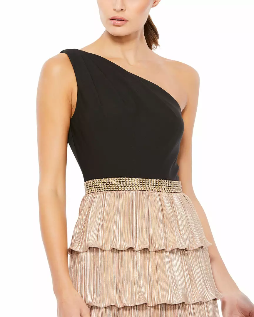 Chic one shoulder gown with a metallic layered skirt and gold rhinestone belt.