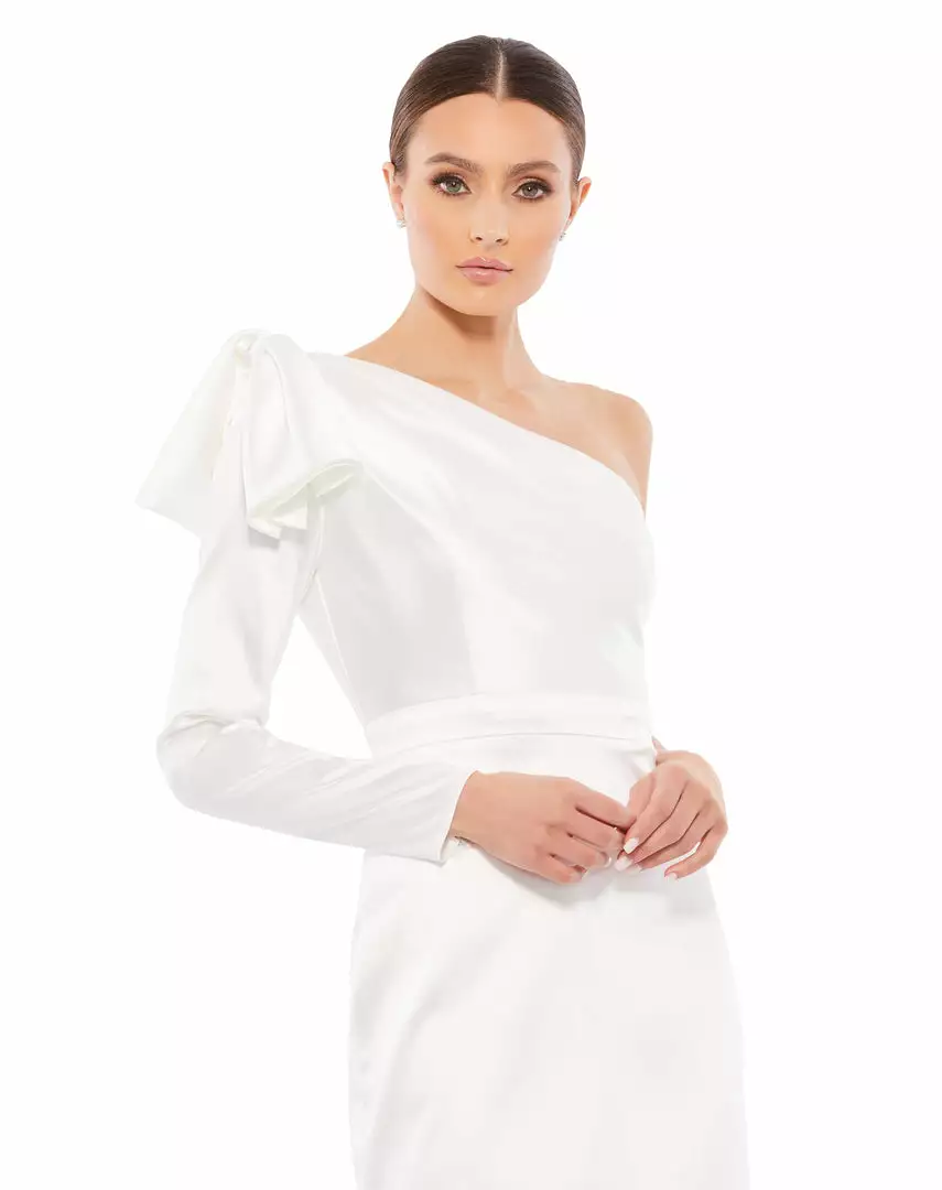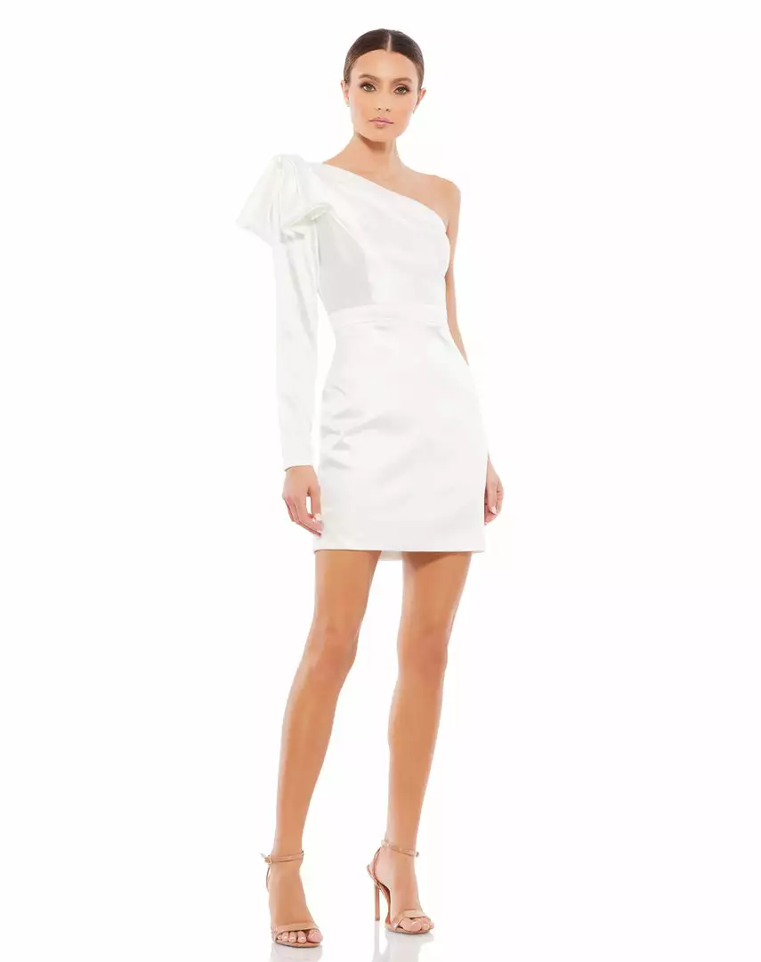 One-sleeve form-fitting satin mini dress with an inset waist and dramatic bow accent at the shoulder.