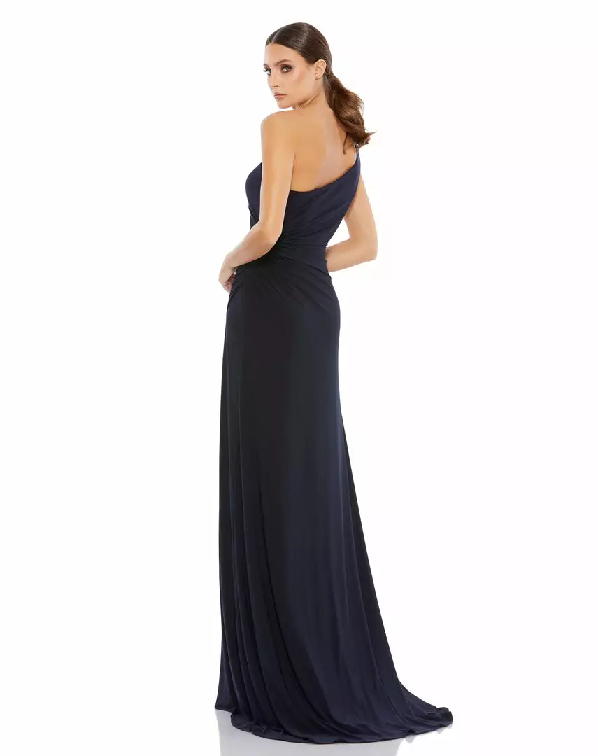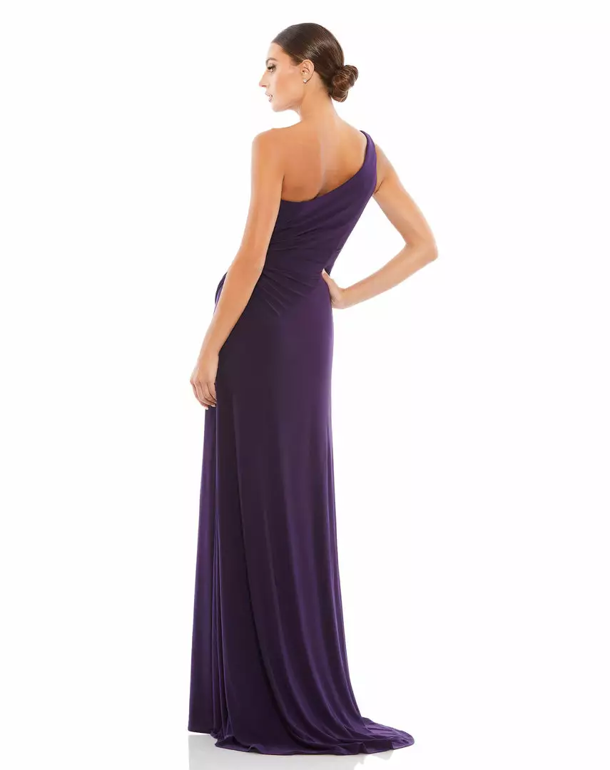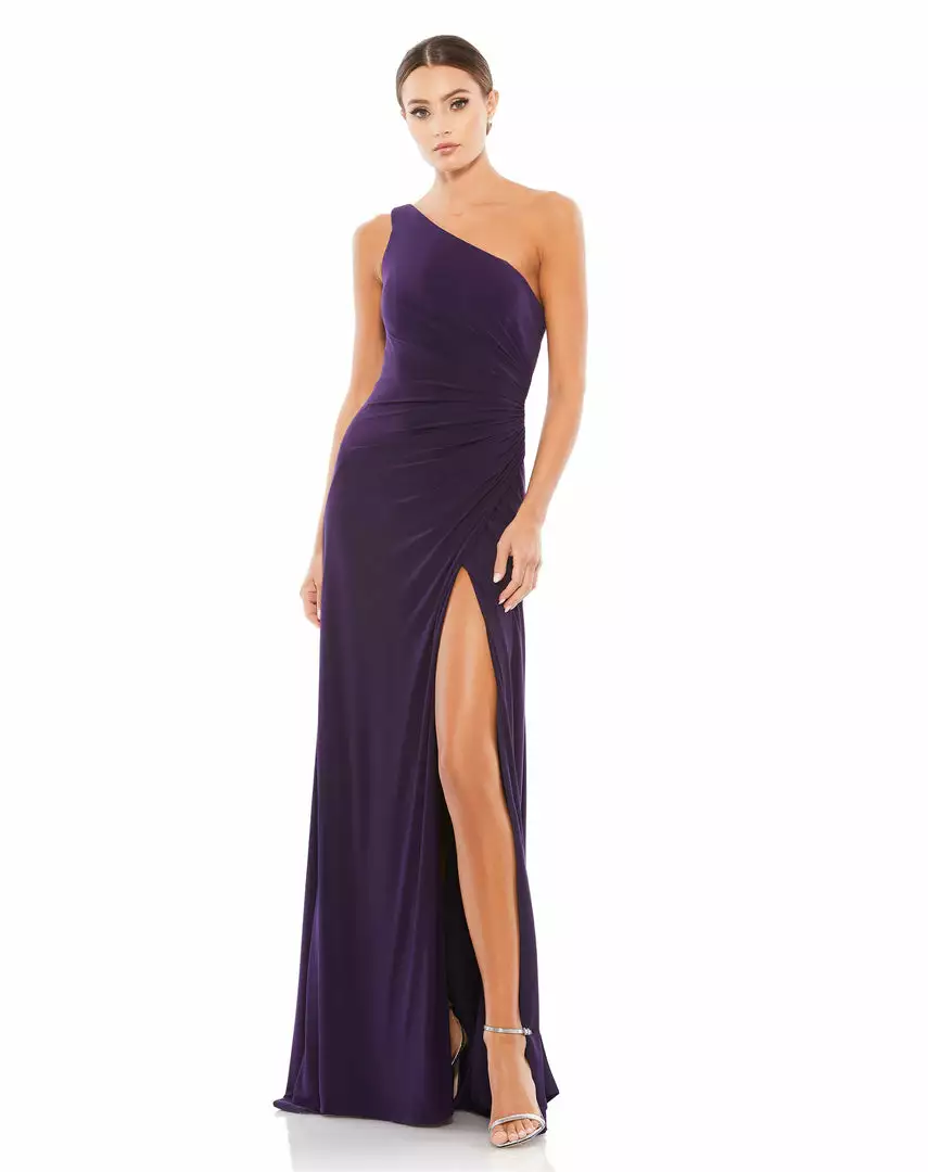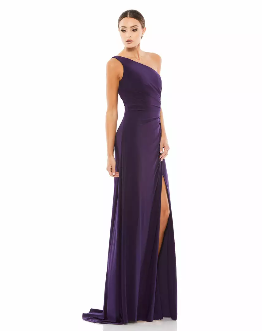 Figure flattering one-shoulder jersey gown with asymmetrical ruching at the waist, a thigh-high slit, and sweeping train.