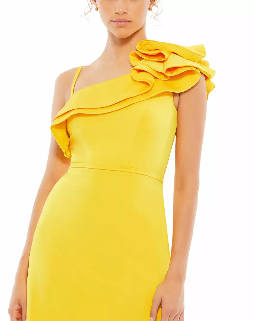 This tailored mini dress features an asymmetrical neckline with a ruffled accent at the left shoulder and a single spaghetti strap on the right shoulder.