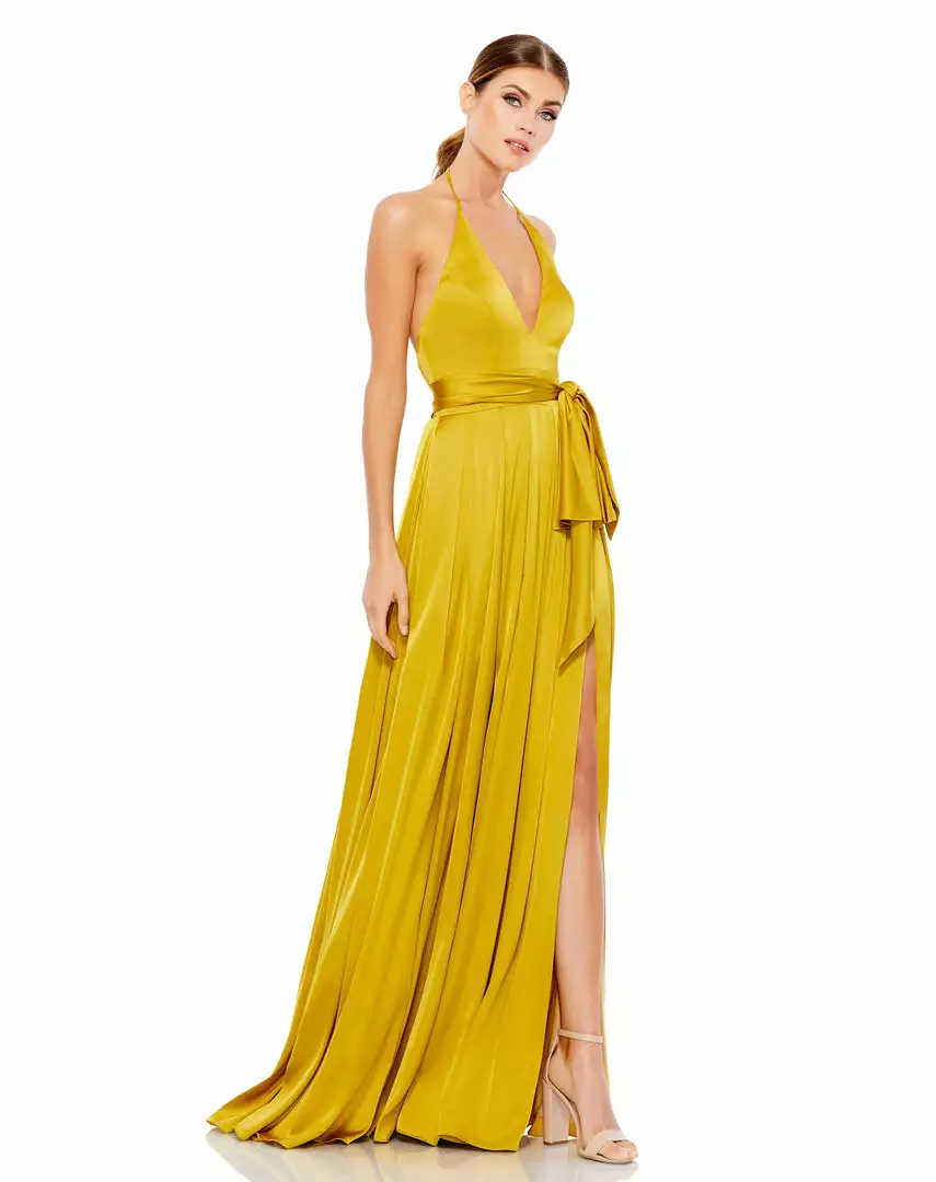 Satin charmeuse halter gown with a plunging v-neckline, sexy open back, a self-tie belted waist, and a floor-length box pleated skirt with a thigh-high slit and sweeping train.