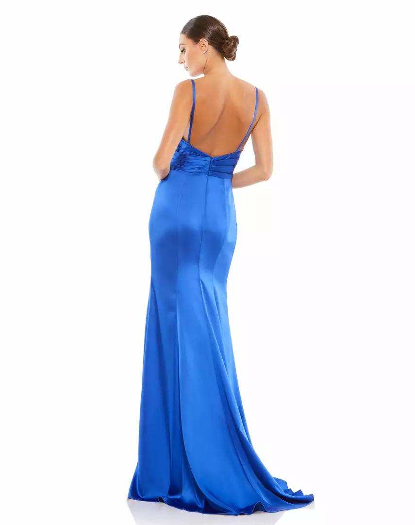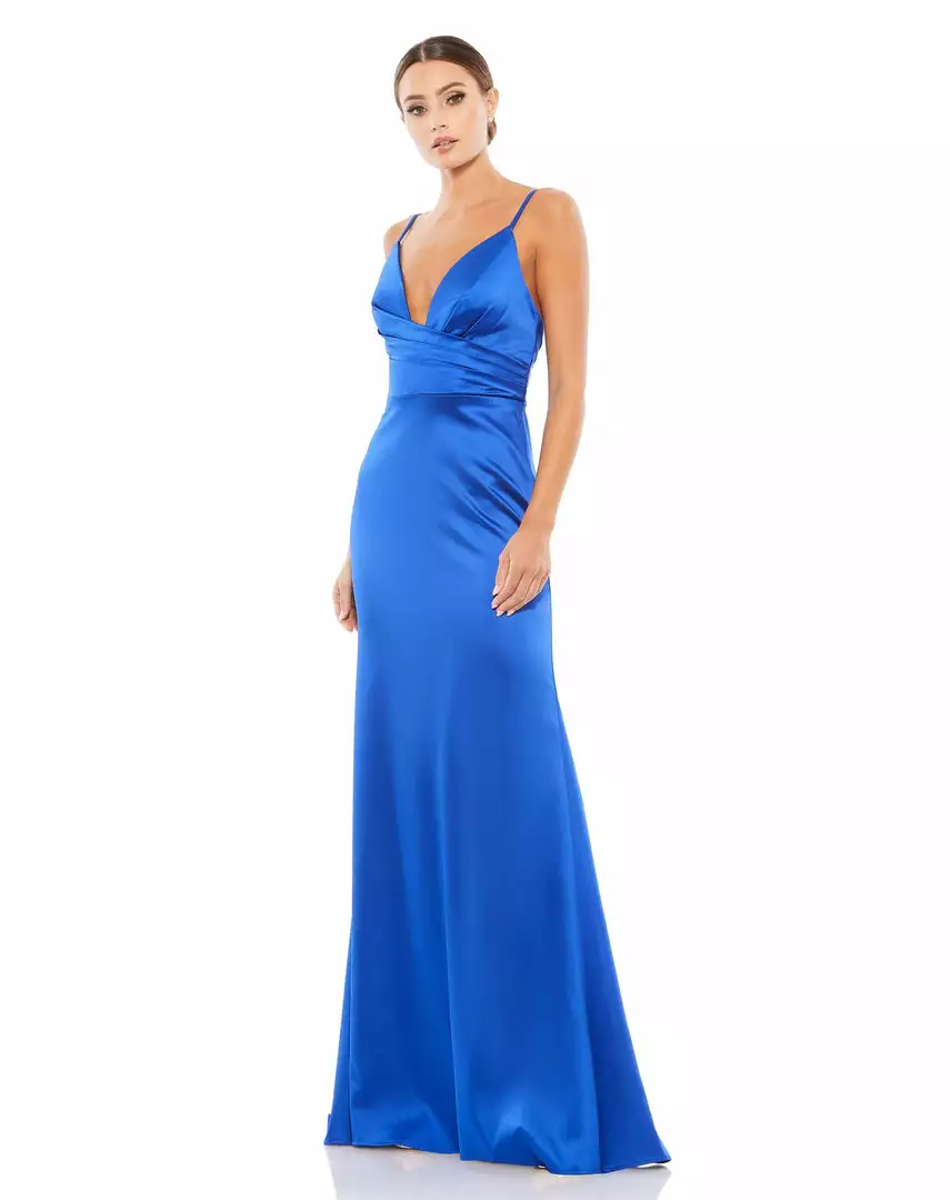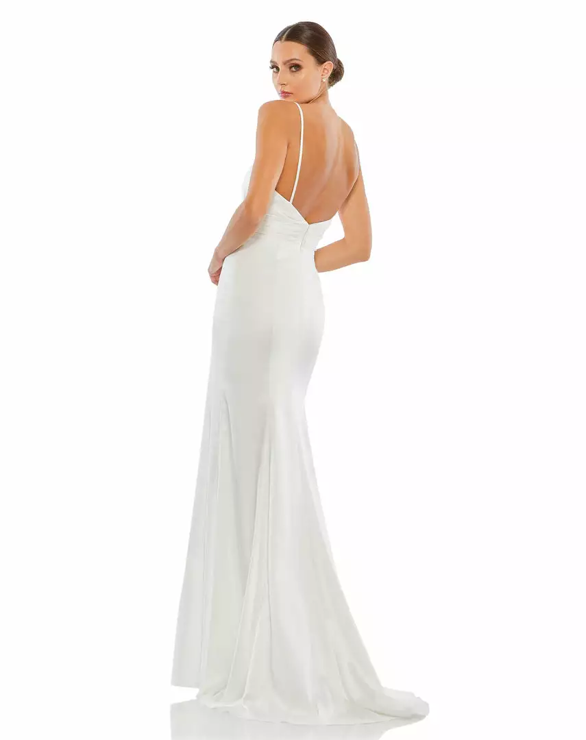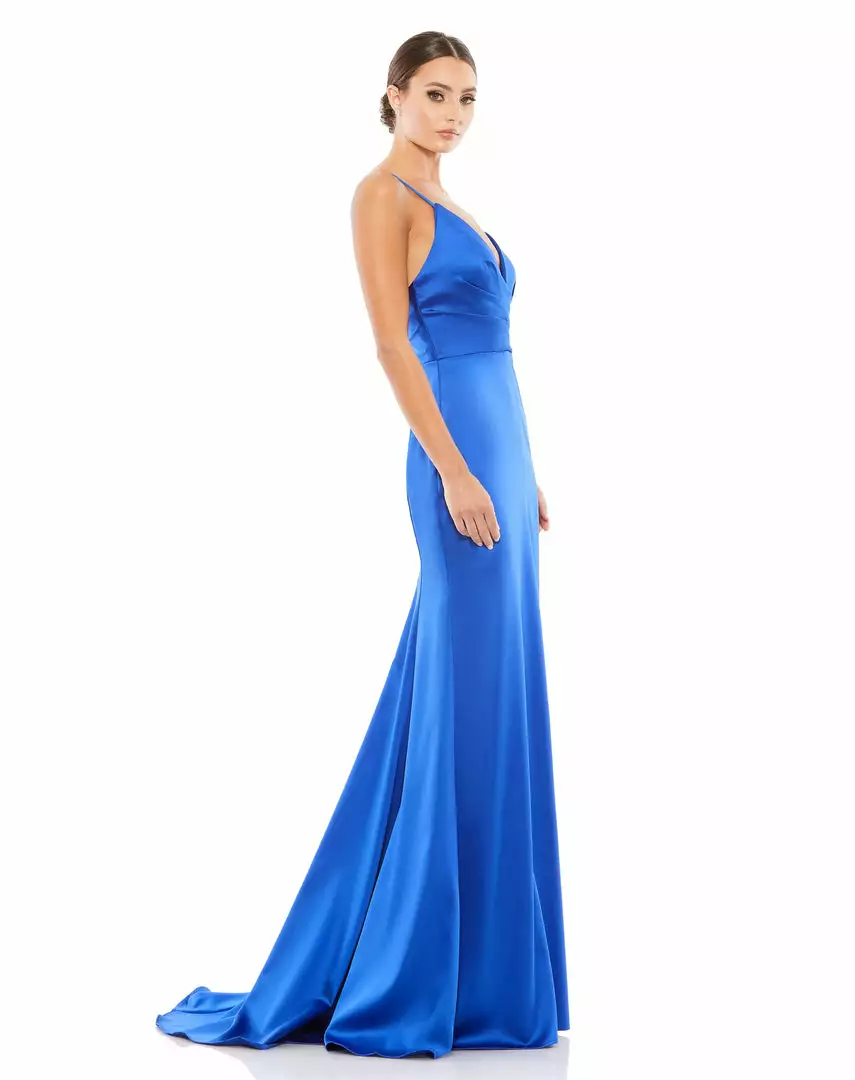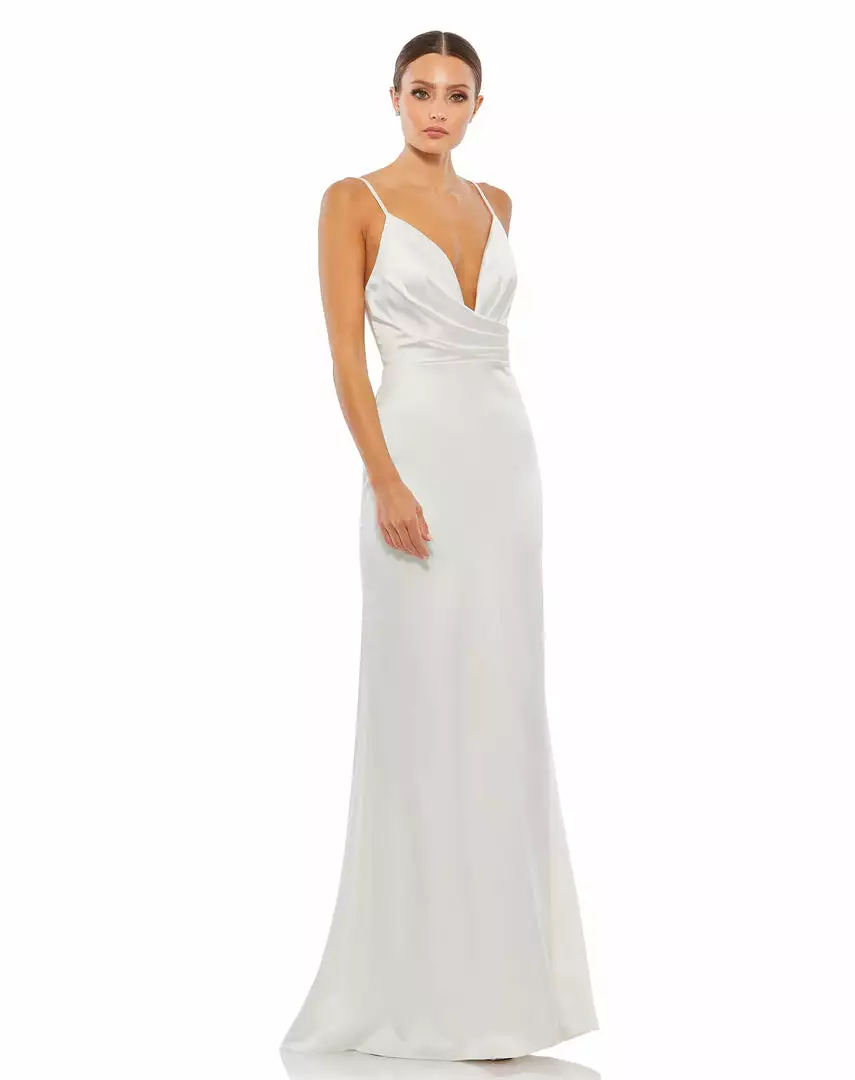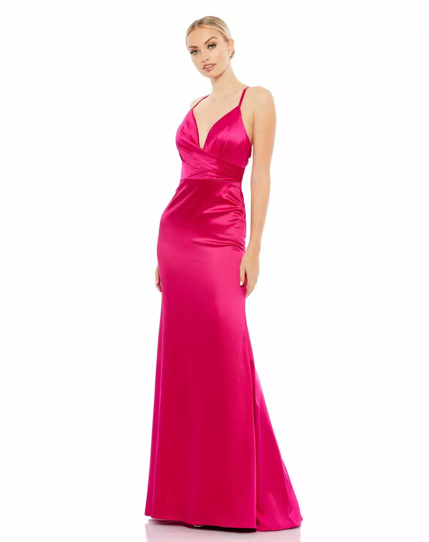 Plunging faux-wrap charmeuse trumpet gown with a low back and gorgeous sweeping train.