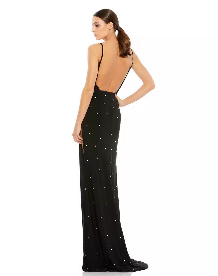 Spaghetti-strap stretch jersey gown with allover rhinestone accents, a thigh-high slit, and sexy open back.