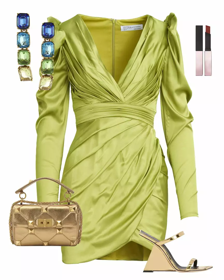 Sexy satin mini cocktail dress accented with dramatic puffed sleeves. This dress features a diagonal pleating across the bodice and skirt, and the waist is accented with a horizontal pleated waistband.