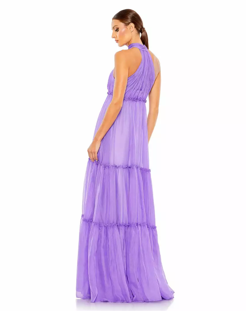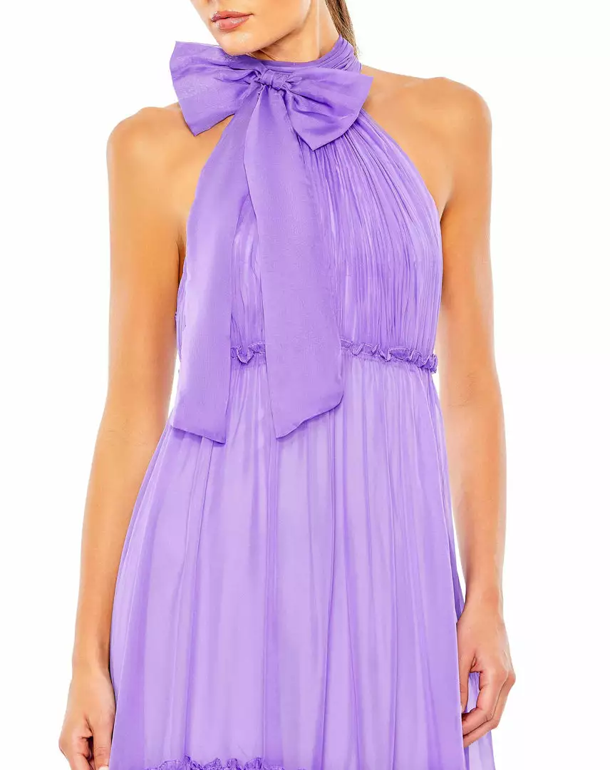 Ieena For Mac Duggal Ruched Tiered High Neck Bow A Line Gown