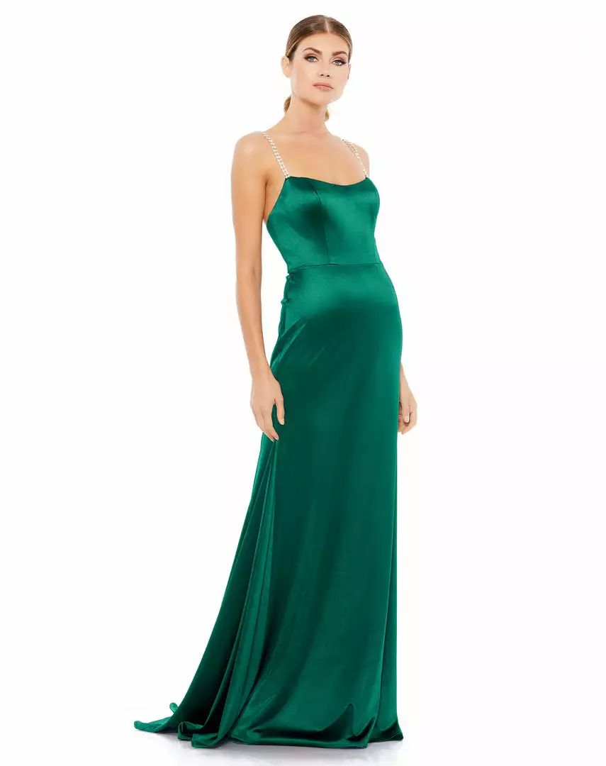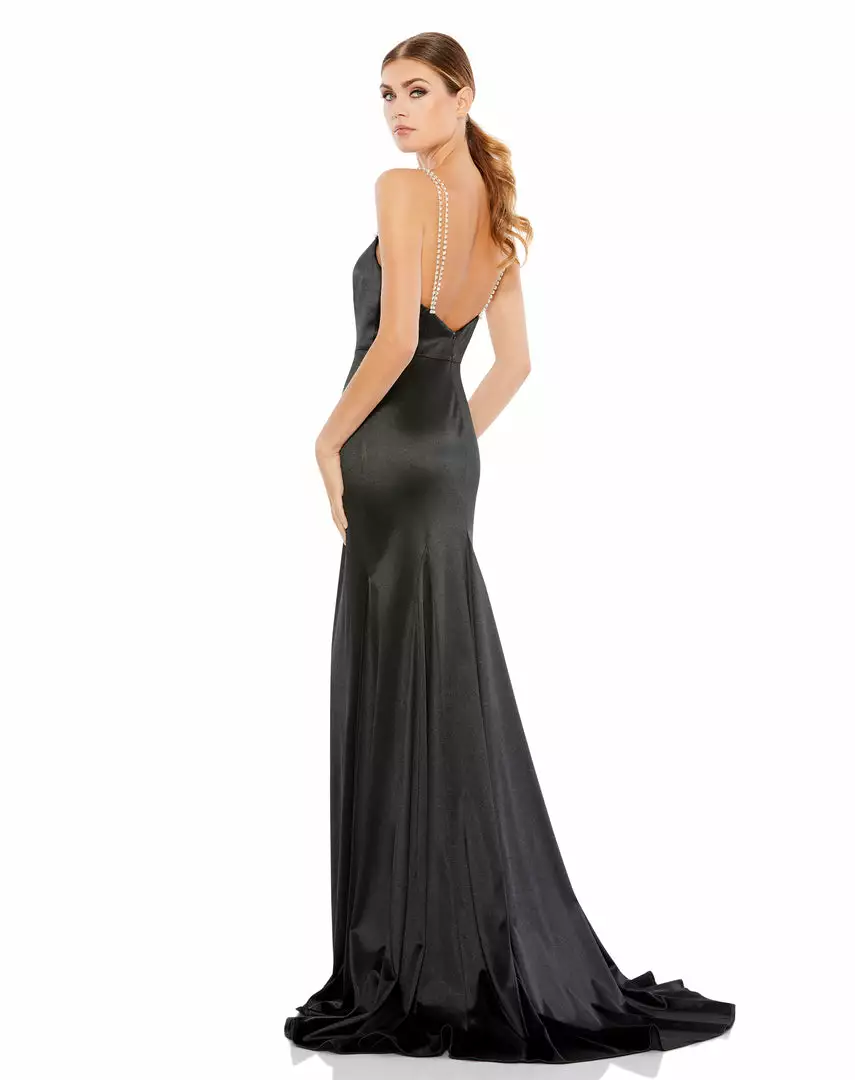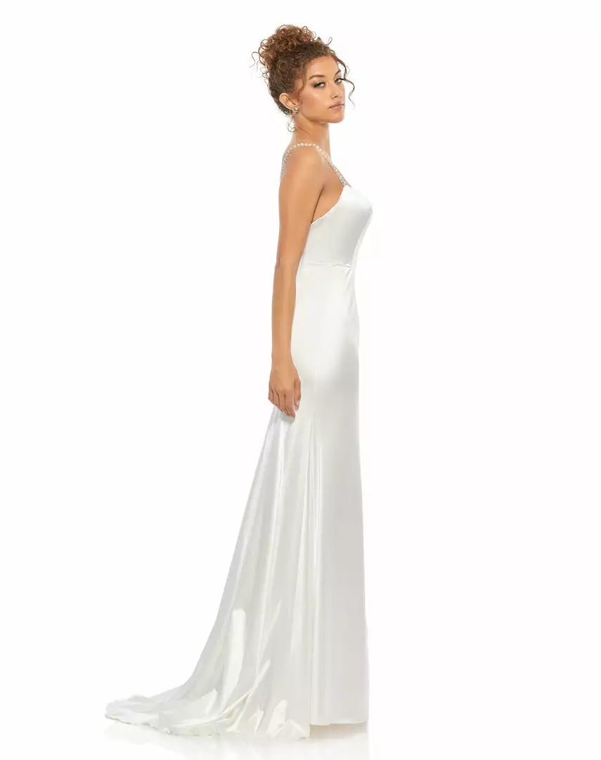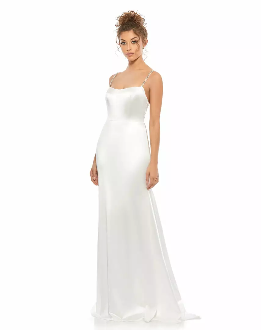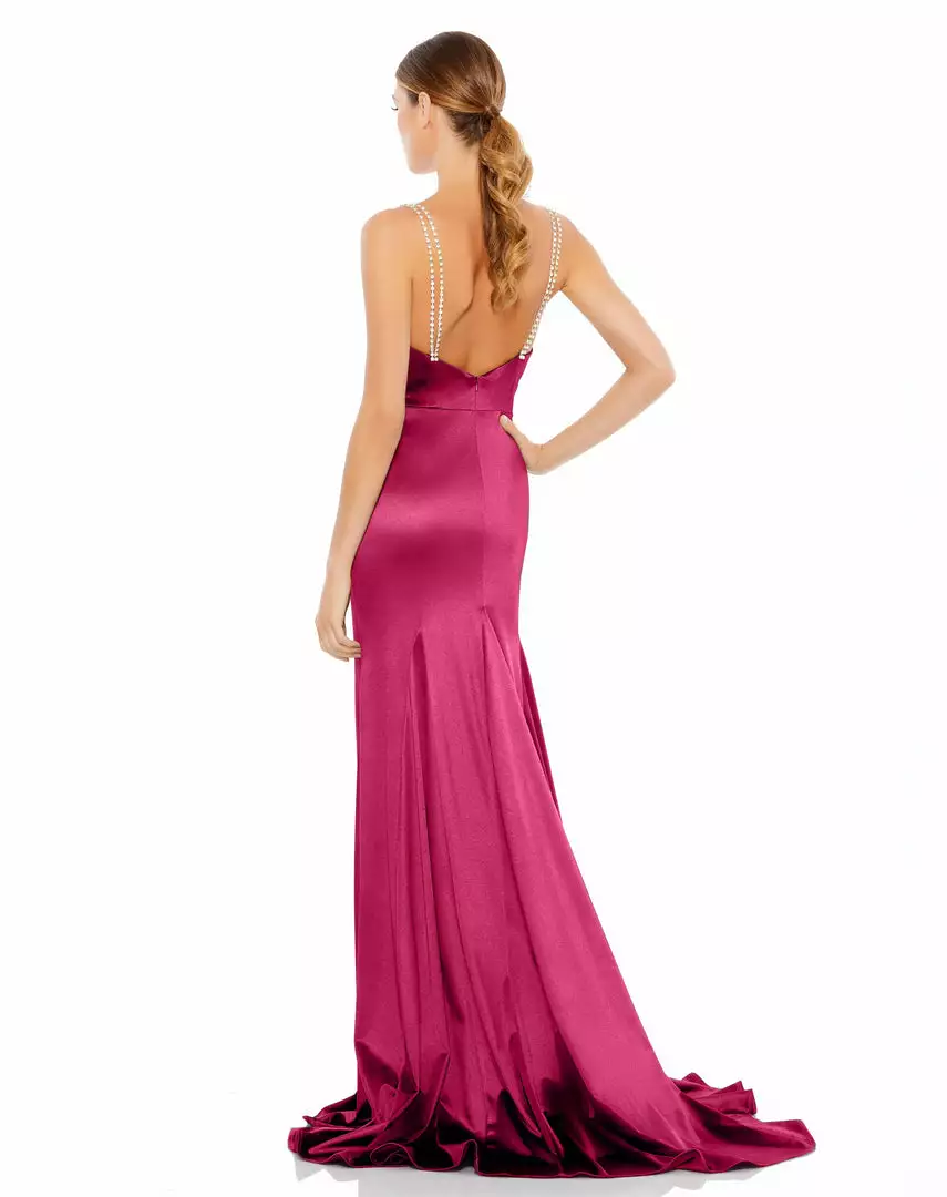 Gorgeous satin gown accented with shimmering crystal-encrusted straps and a sweeping train.