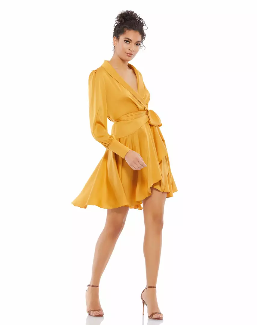Chic long-sleeved wrap dress with a shawl lapel and flirty pleated hi-low skirt.