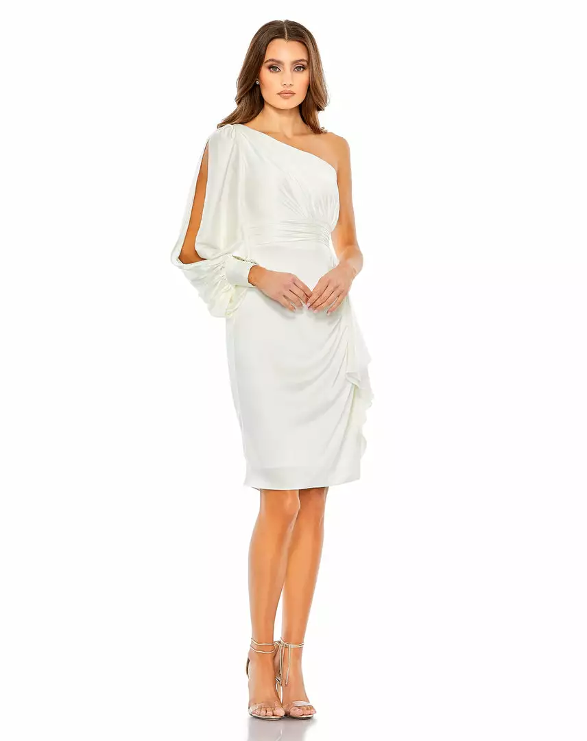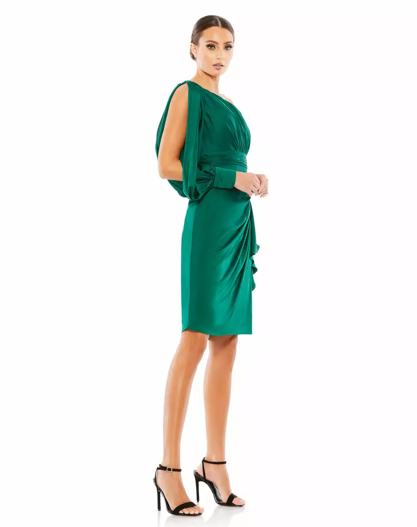 Satin one sleeved ruched cocktail dress with a cascading ruffle.