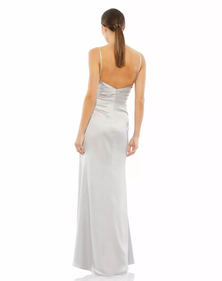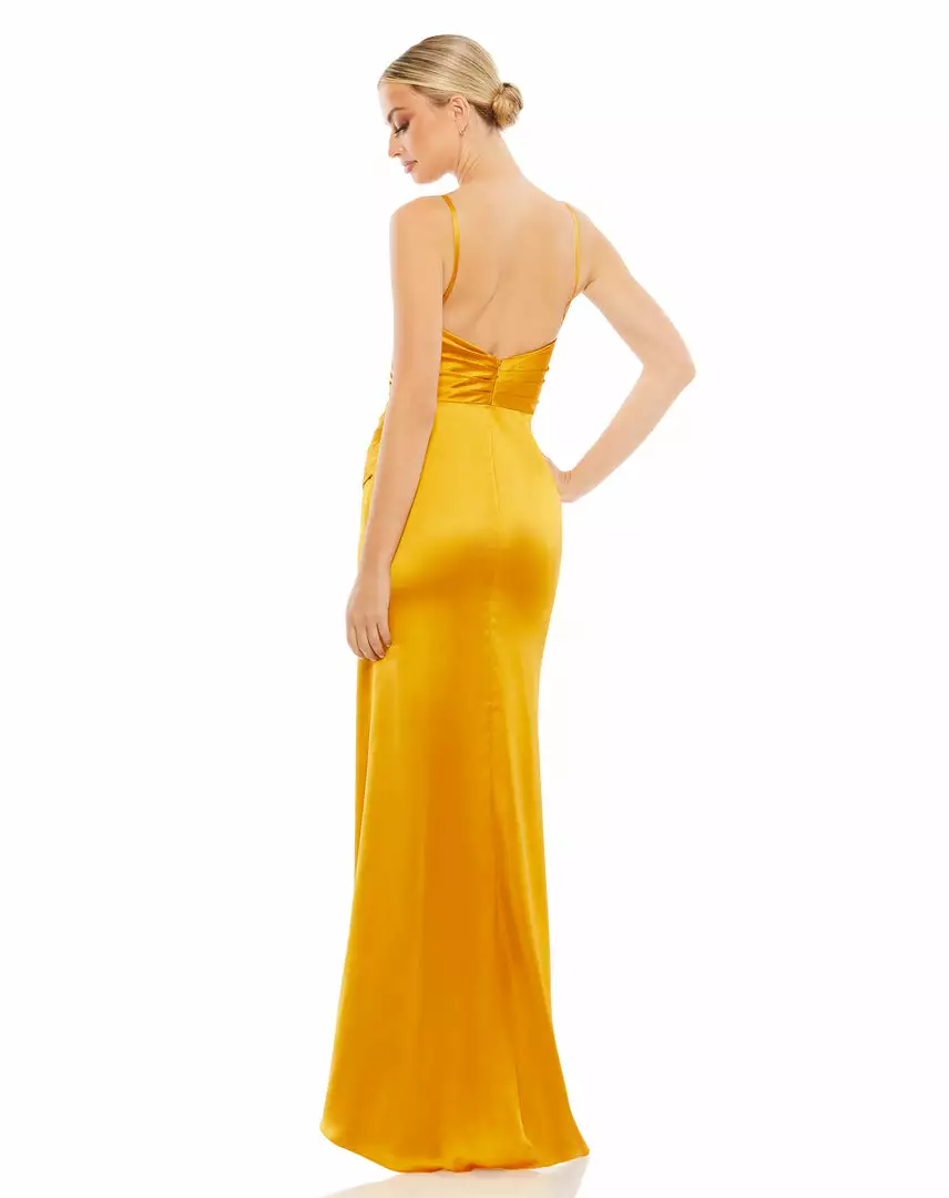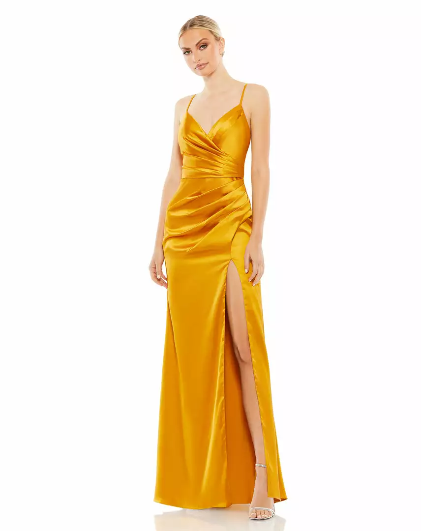 Ieena For Mac Duggal Satin Sleeveless Faux Wrap Ruched Gown Shop For