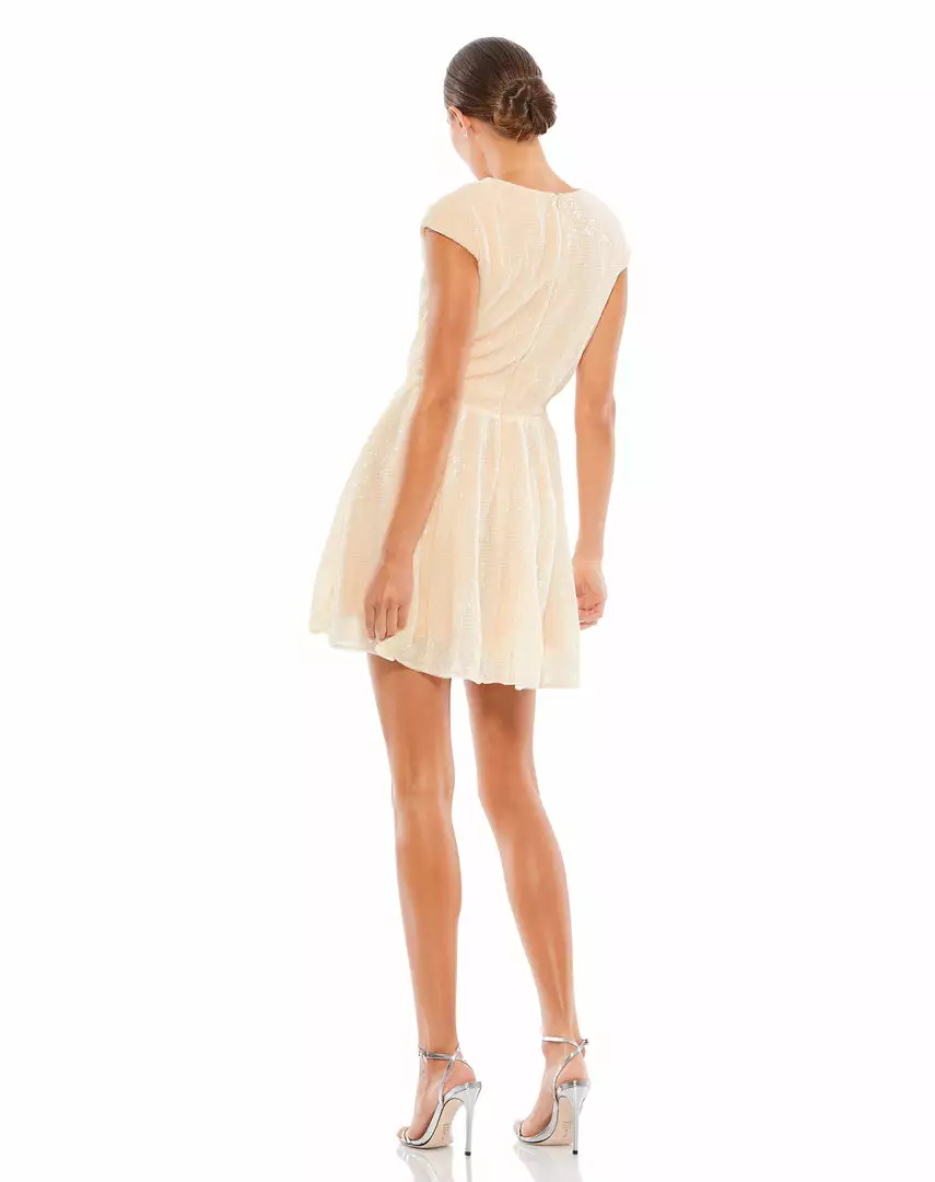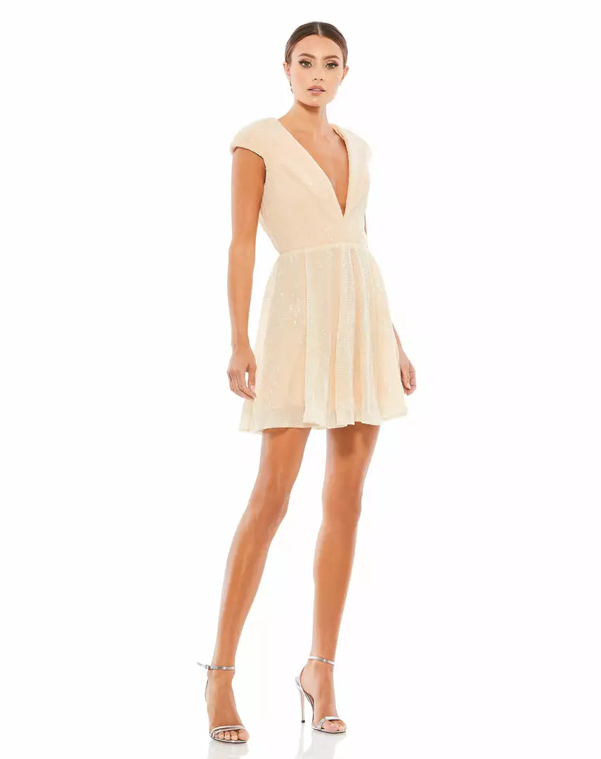 Flirty fit-and-flare cocktail dress with a fitted bodice, daring plunge neckline, and a full A-line skirt. The dress is fully lined and features a sequined mesh overlay.