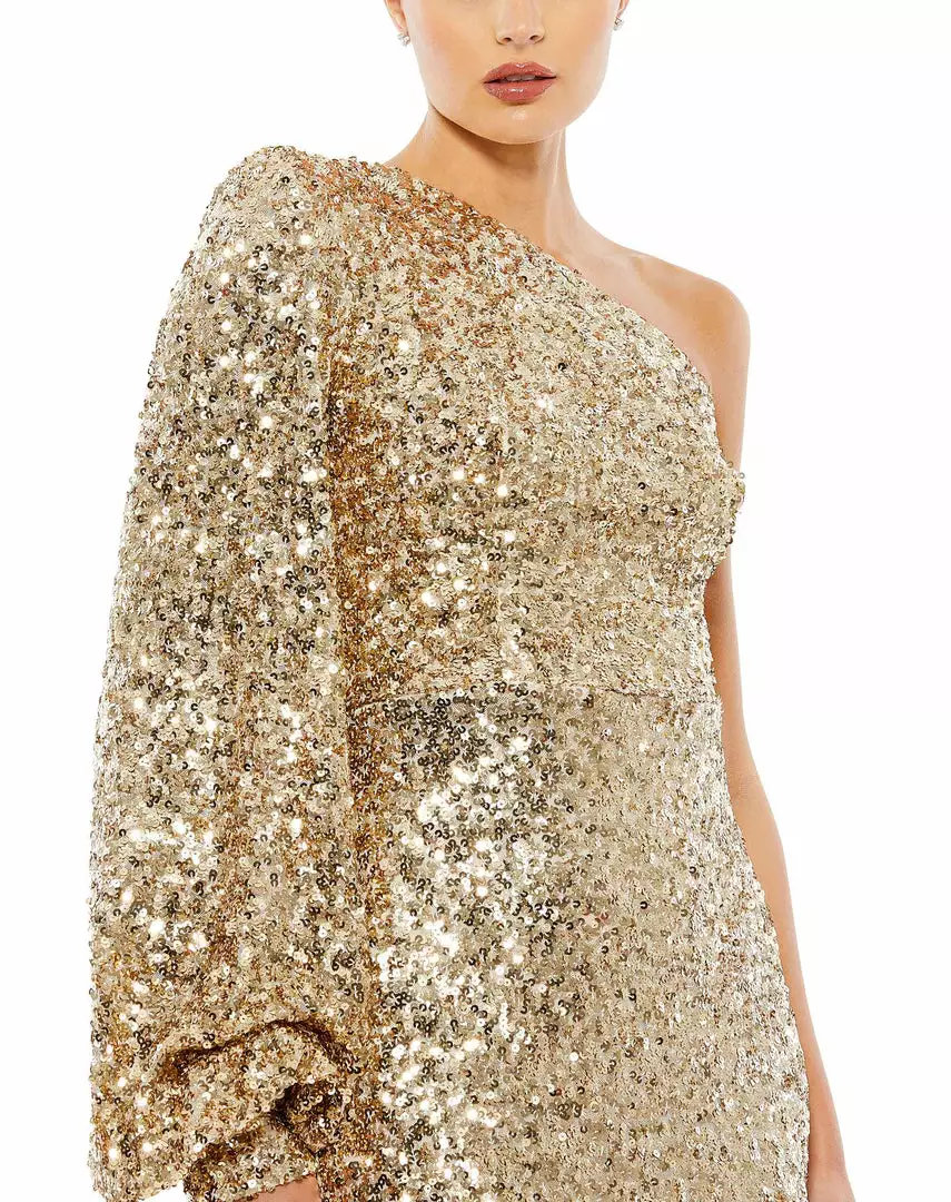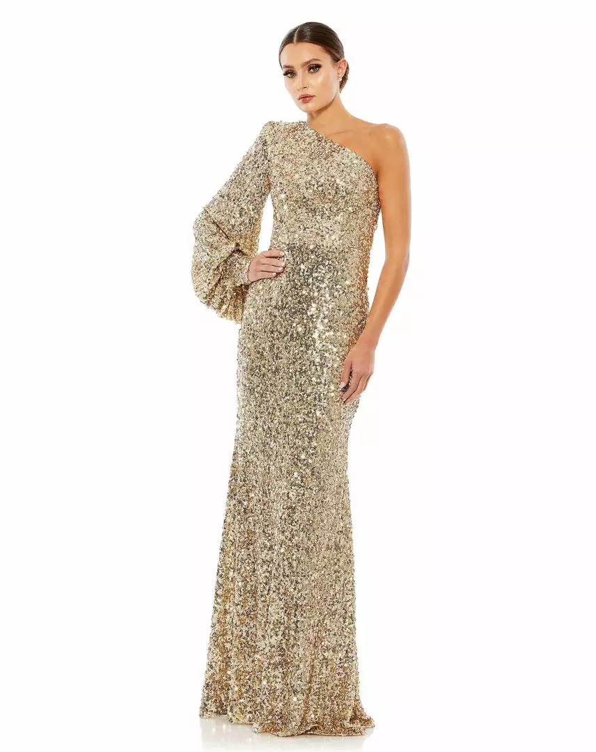 Ieena For Mac Duggal Sequined One Shoulder Bishop Sleeve Trumpet Gown