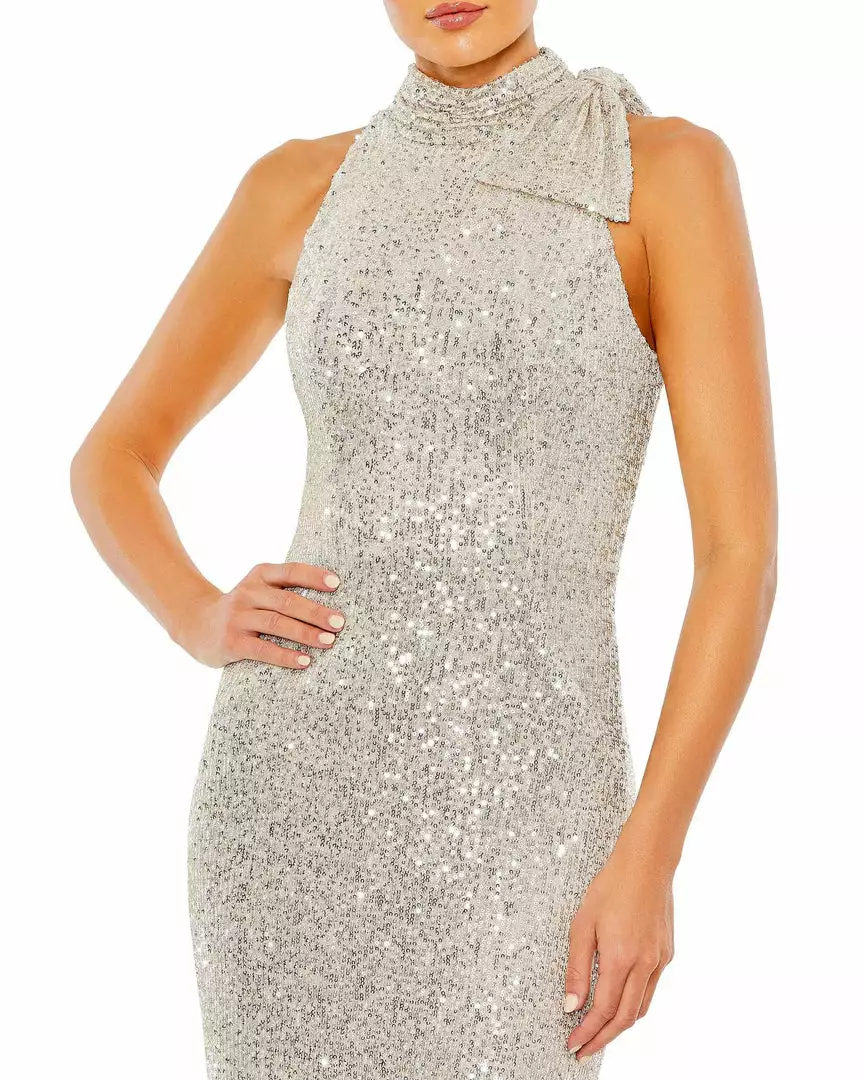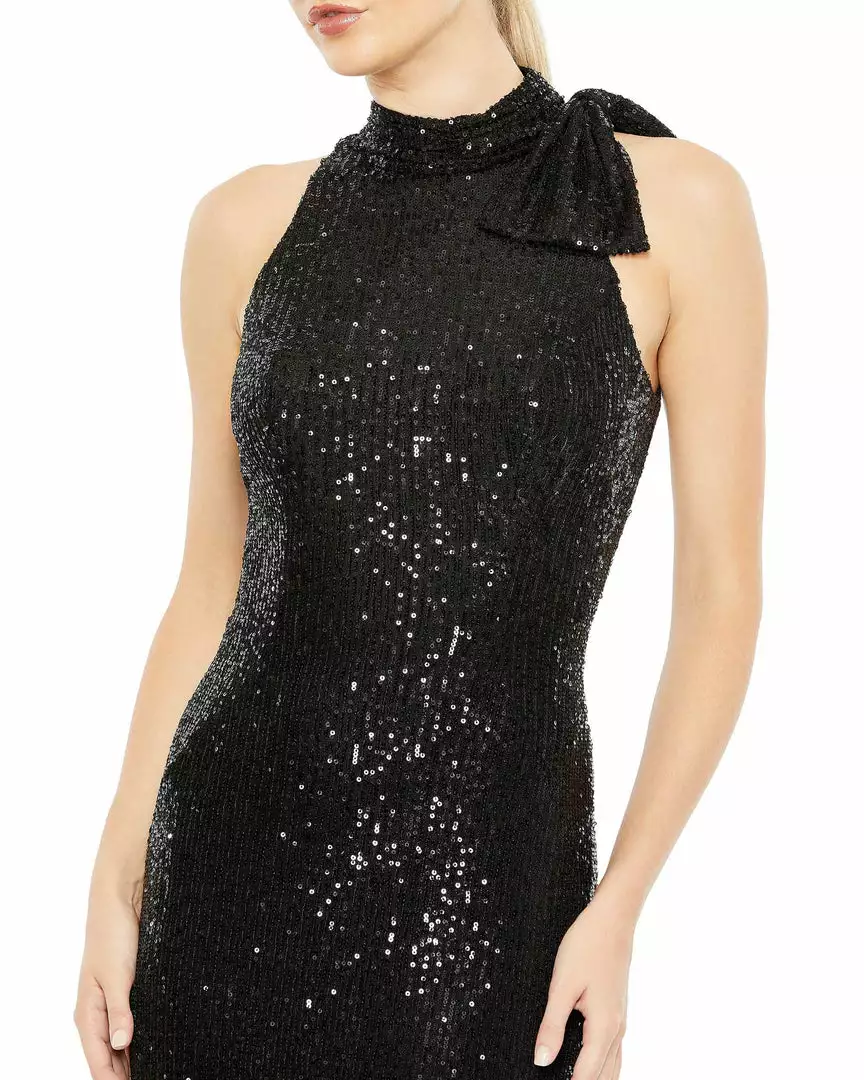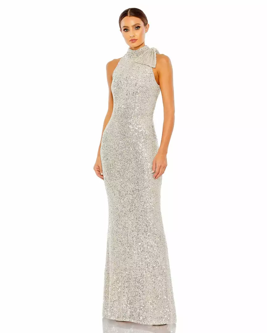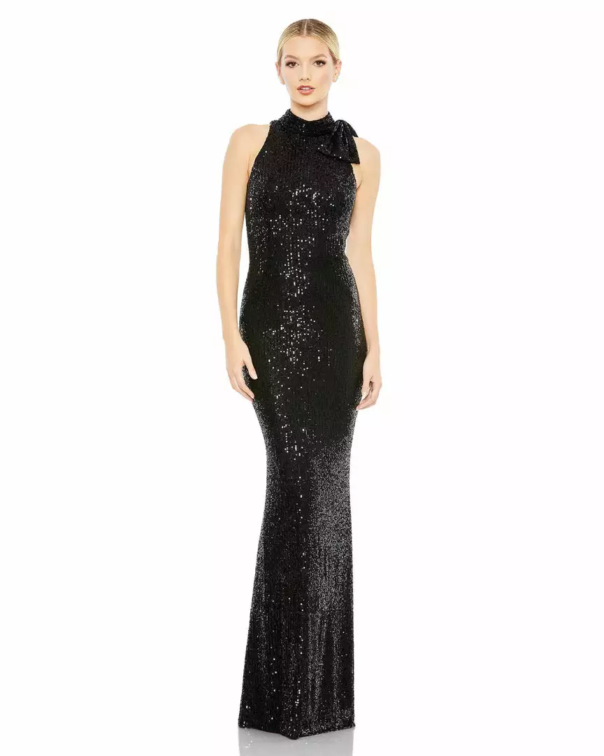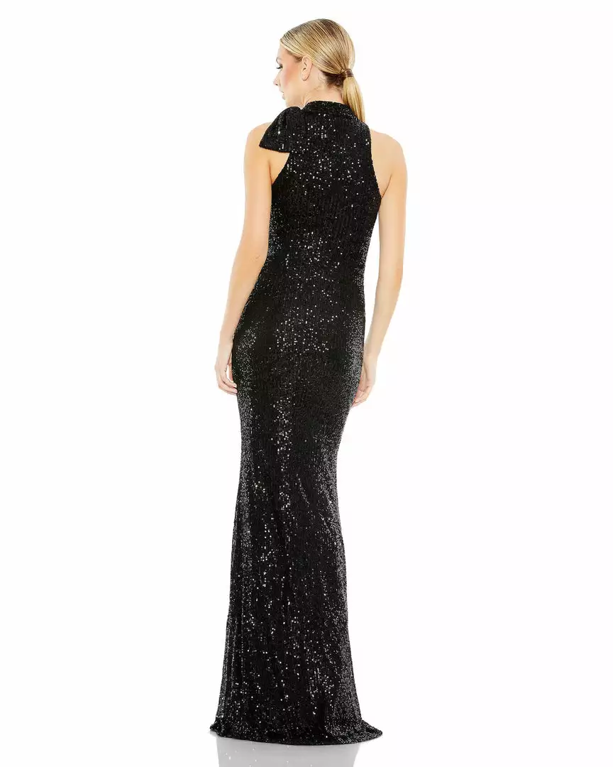 Ieena For Mac Duggal Sequined Soft Tie Halter Neck Column Gown