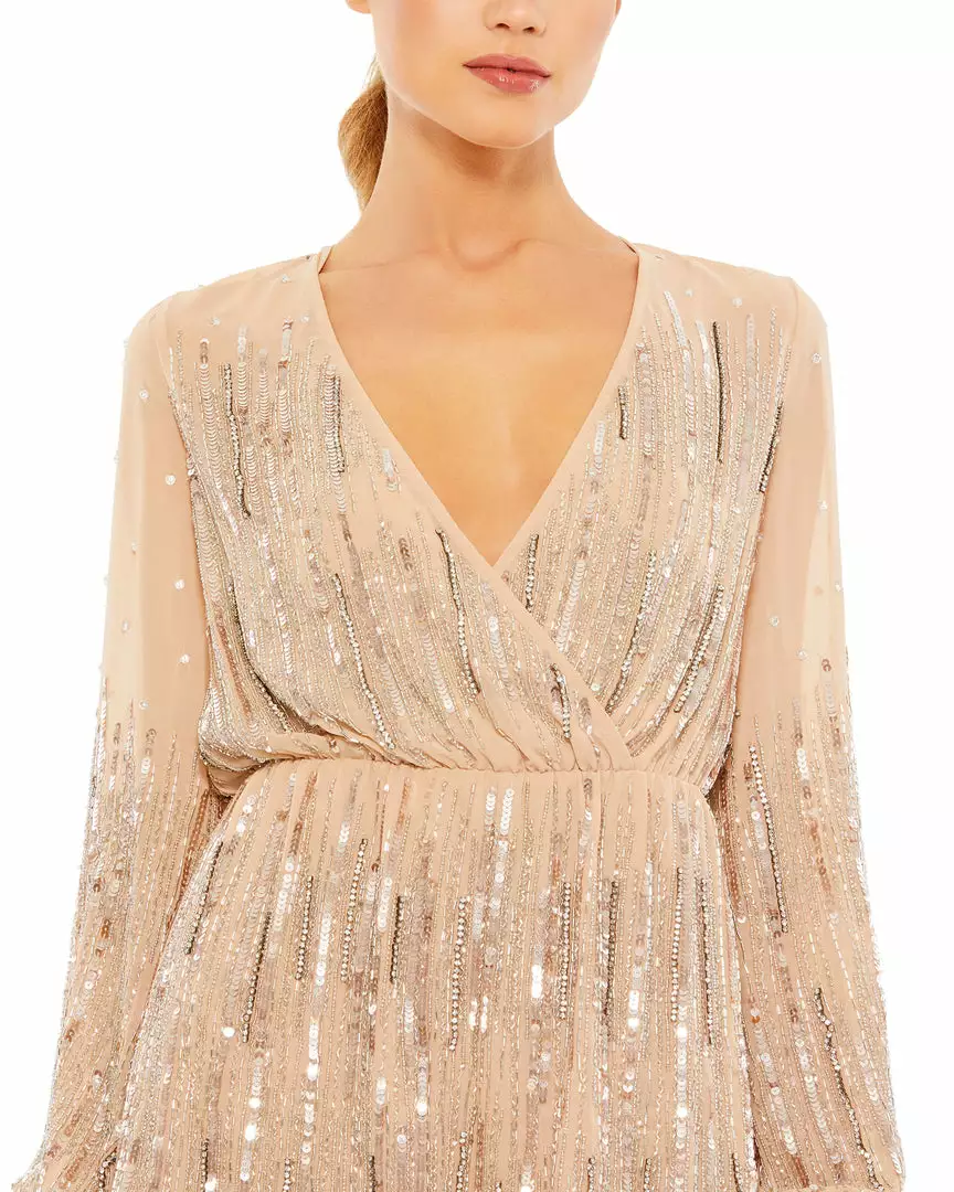 Sexy surplice long-sleeved romper with vertical sequin embellishment.