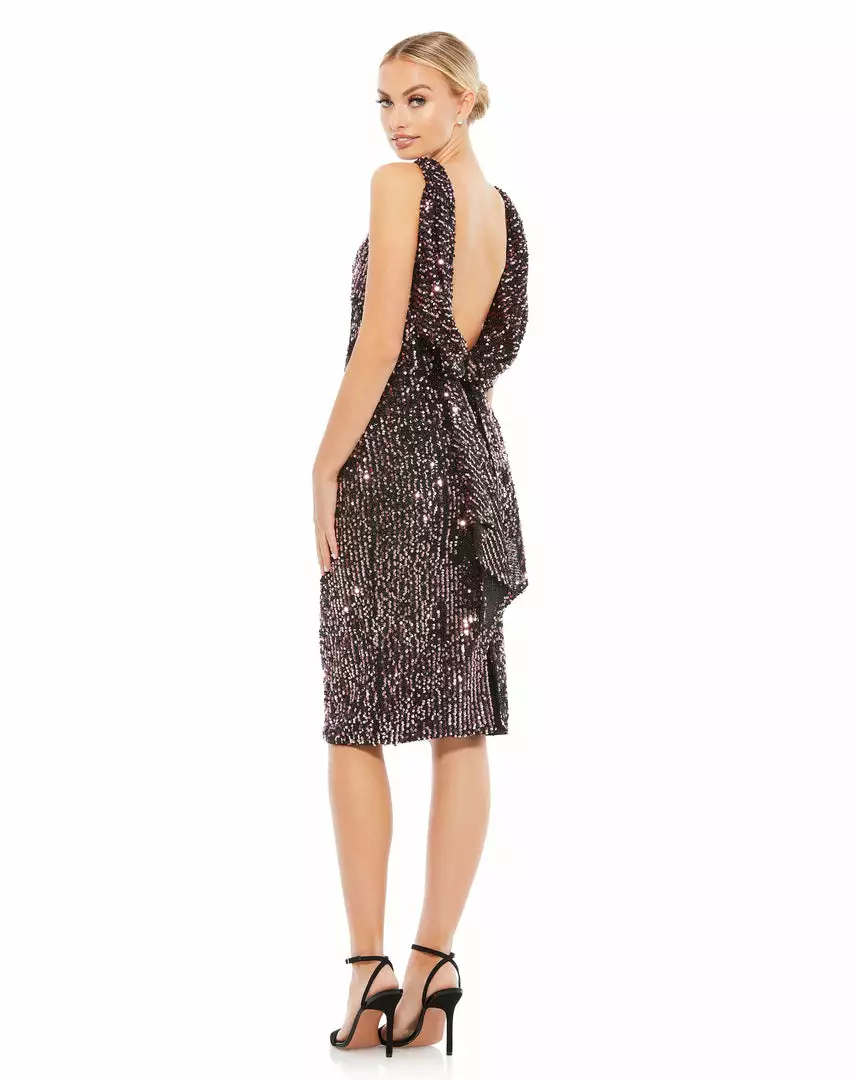 Elegant stretch sequin cocktail dress with a plunging draped back and back vent slit.