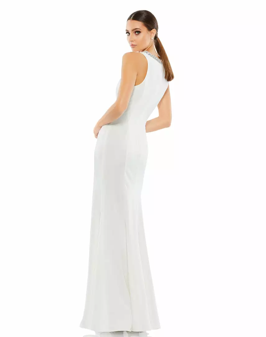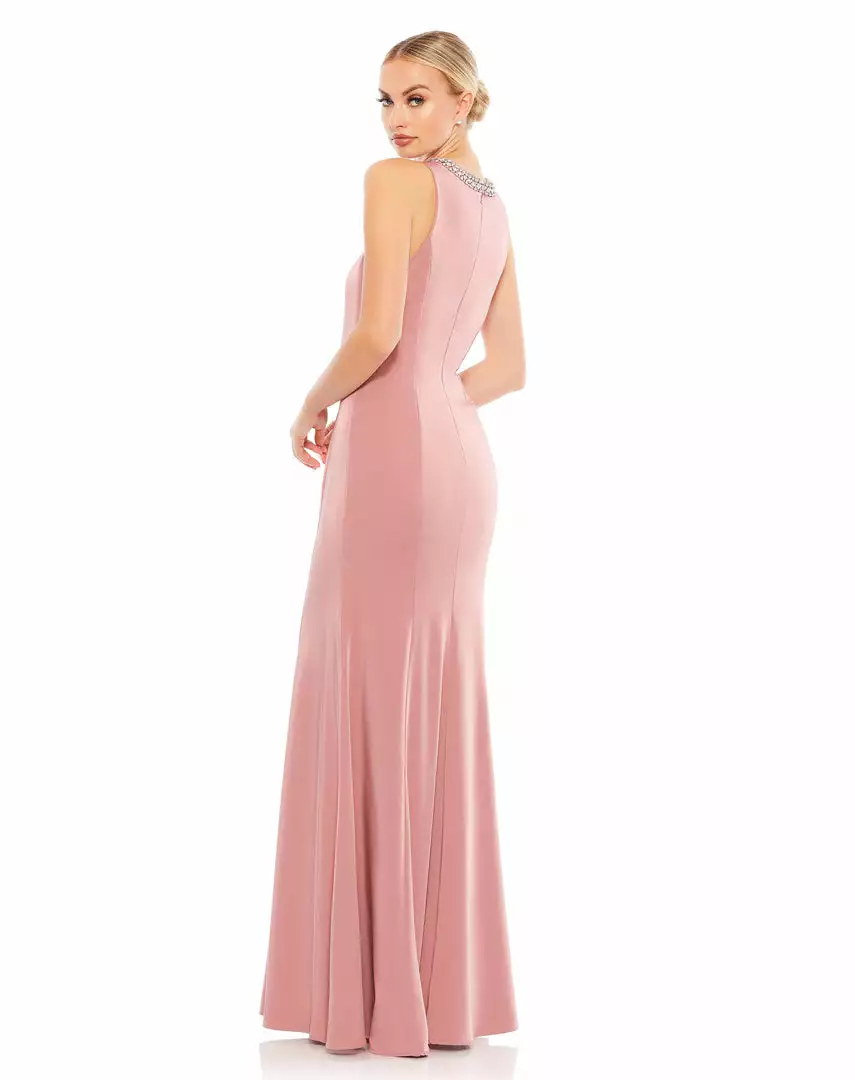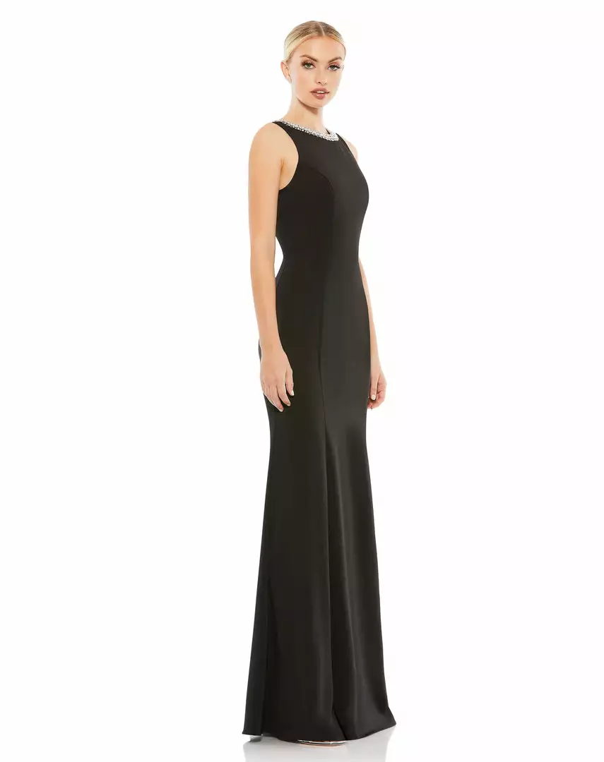 This dreamy satin gown is both classic and elegant. This floor-length, form-fitting trumpet gown is fitted through the bodice and waist and features a flared trumpet skirt. The neckline is encrusted with rhinestones for extra sparkle.