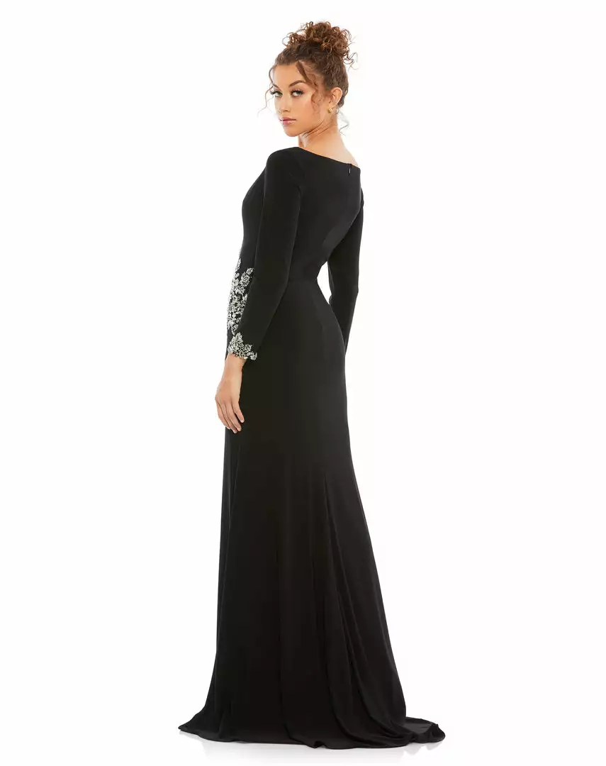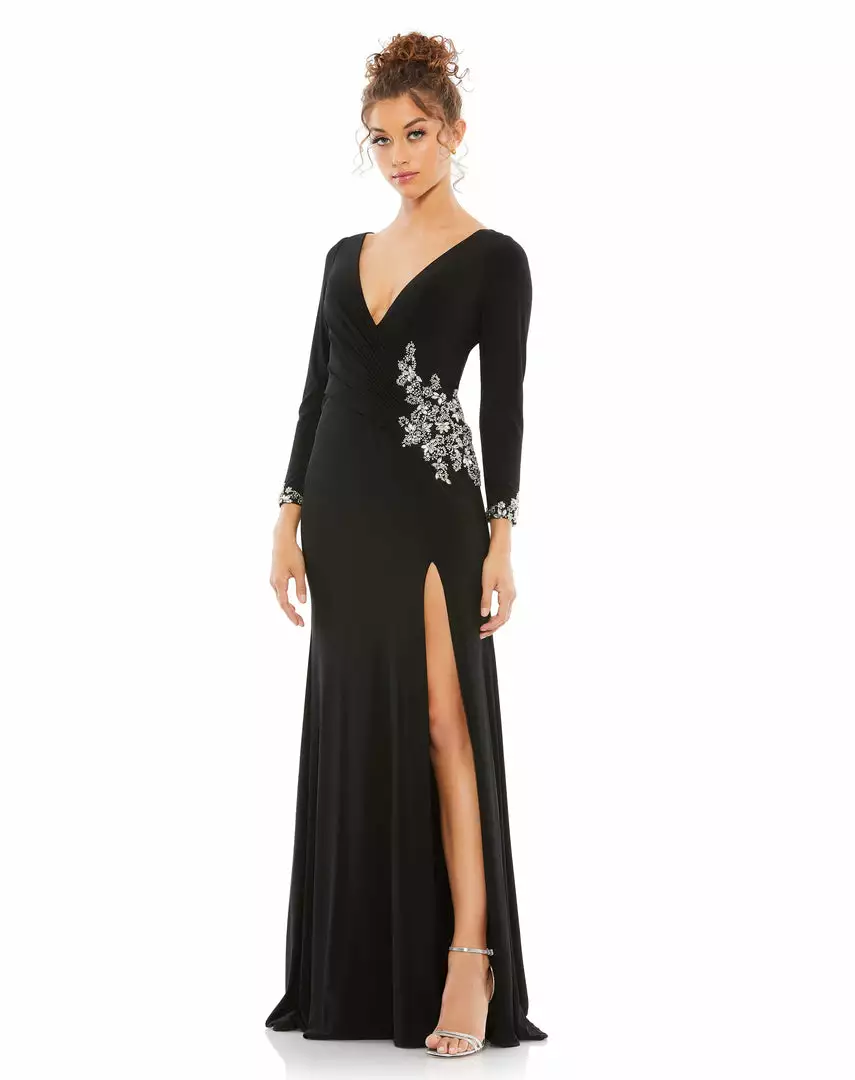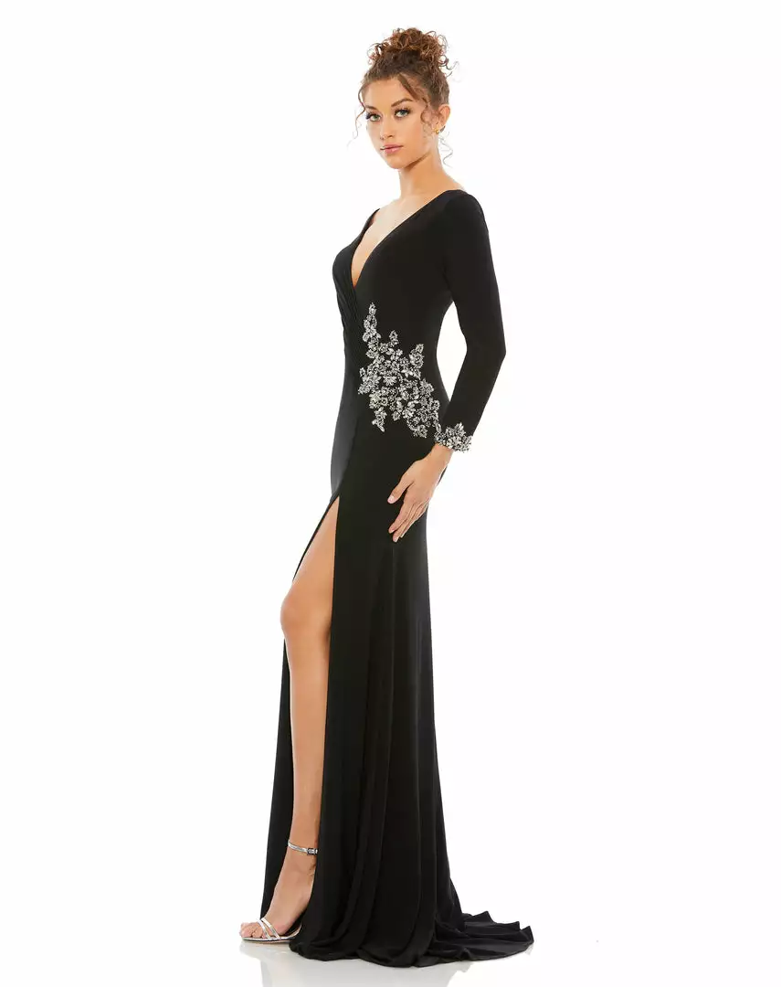 Long-sleeve plunging v-neck jersey gown with a thigh-high front slit and a floral rhinestone-embellished ruched waist.