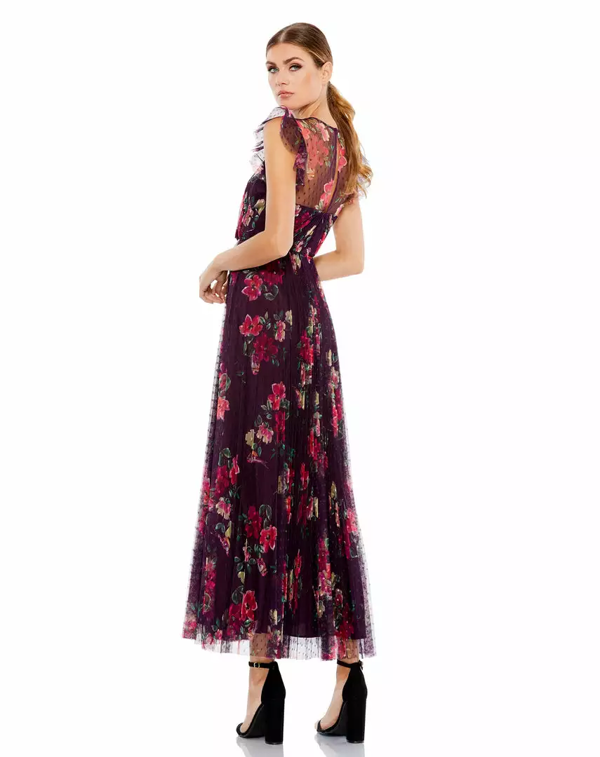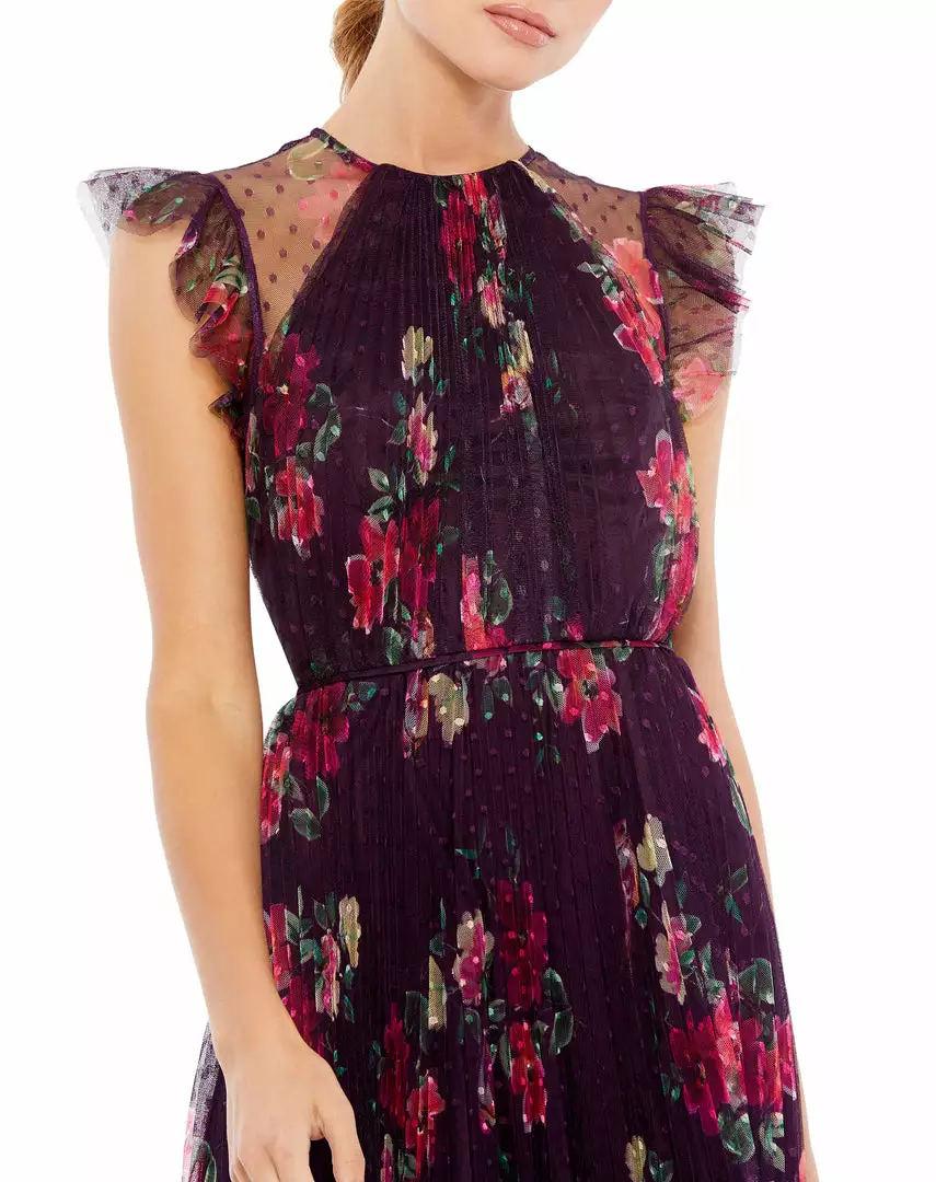 Plum floral tea-length dress with flutter sleeves and sheer insets at the shoulder.