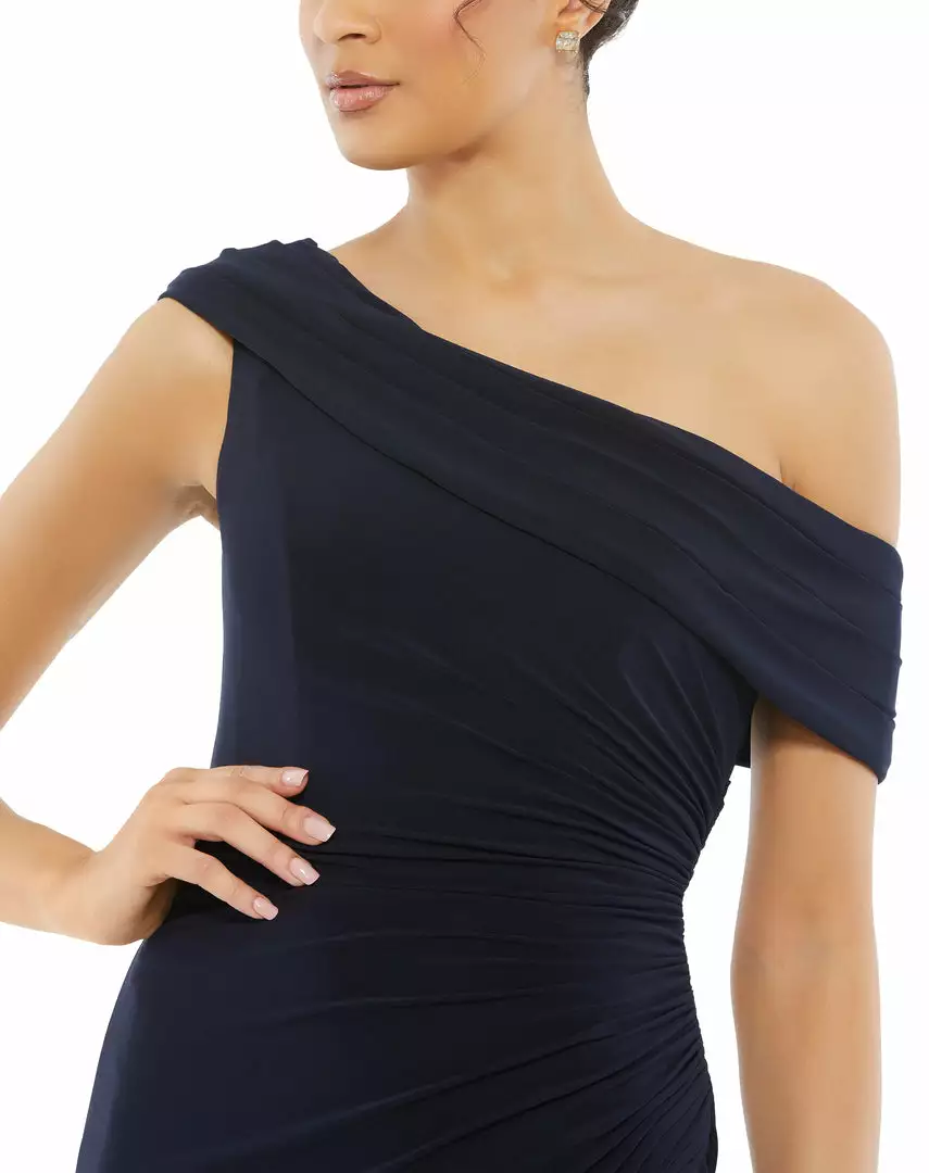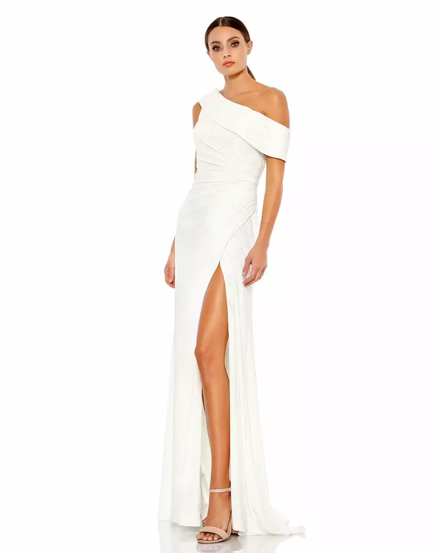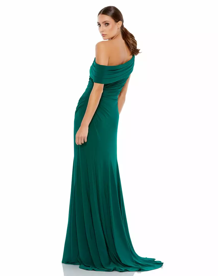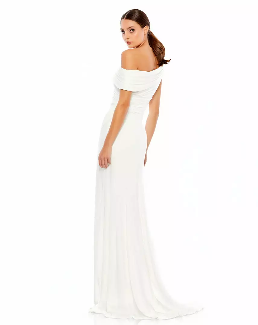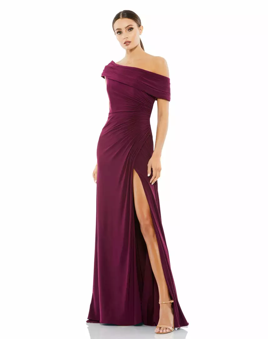 Foldover off-the-shoulder jersey gown with a flattering ruched bodice and a thigh-high slit.