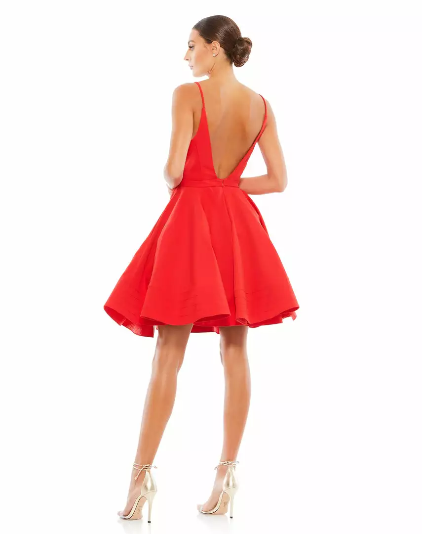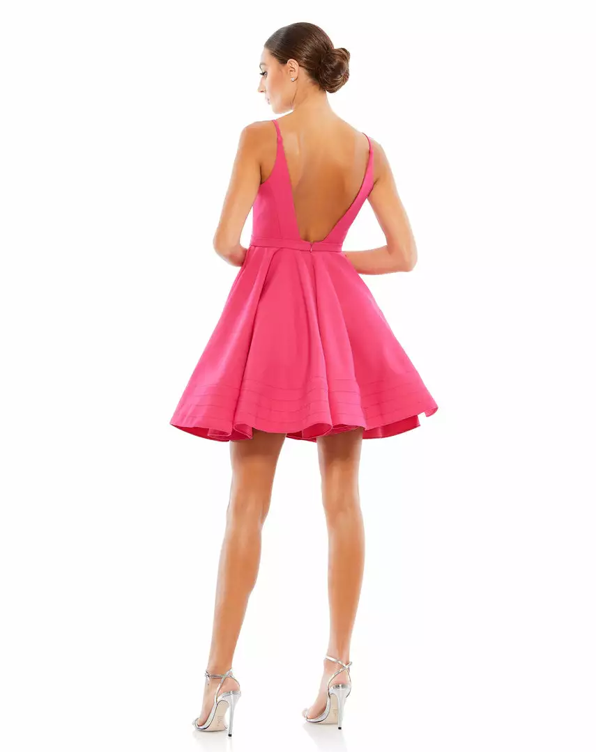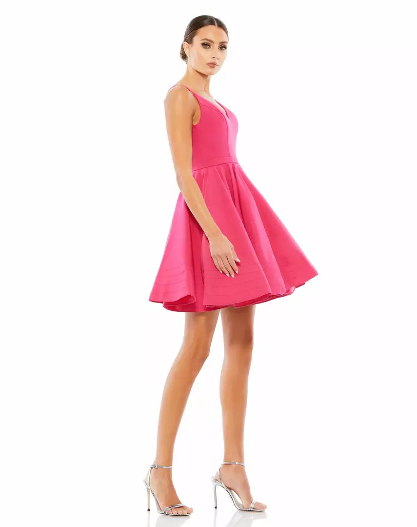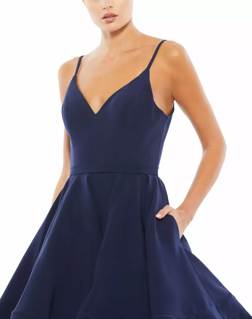 Perfectly tailored fit-and-flare dress finished with a deep v-neck and pockets.