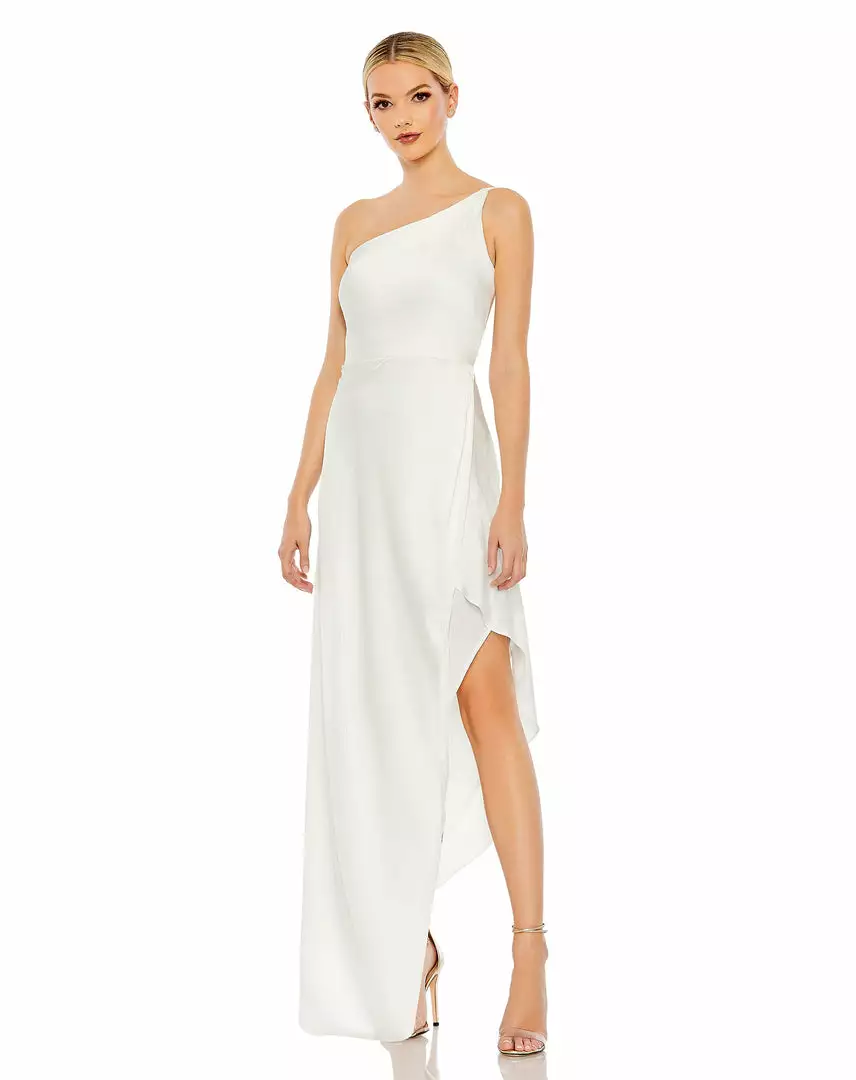 Sexy one-shoulder draped satin dress with a a hi-low hem and daring slit.