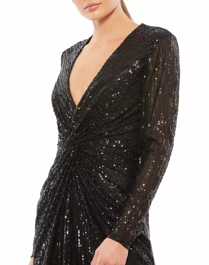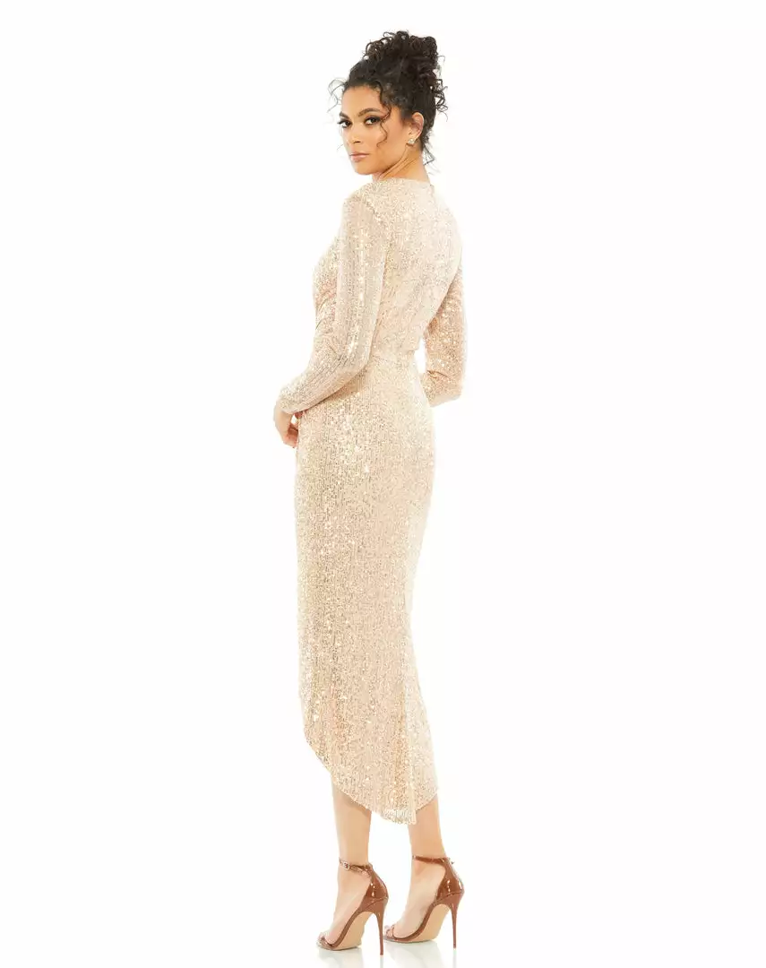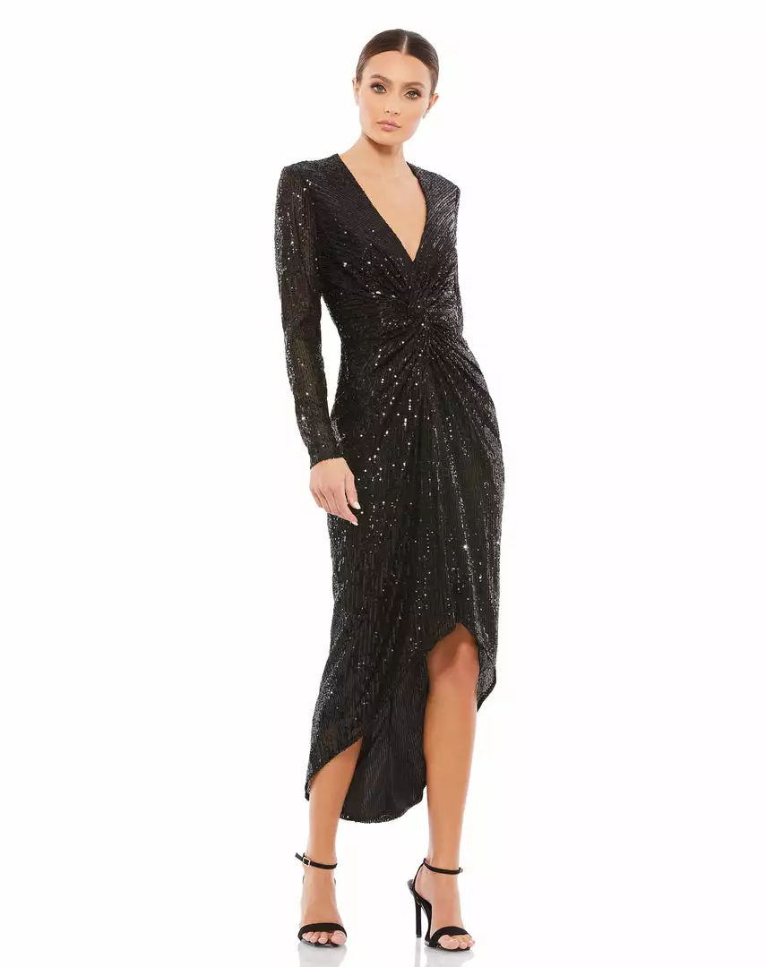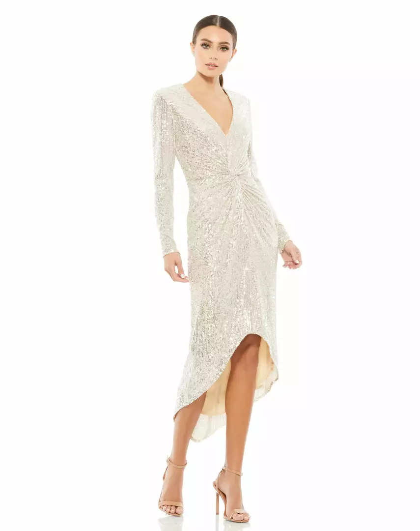 Long-sleeved, fully-sequined cocktail dress with a v-neckline, knot detailing at the waist, and a hi-low hem.