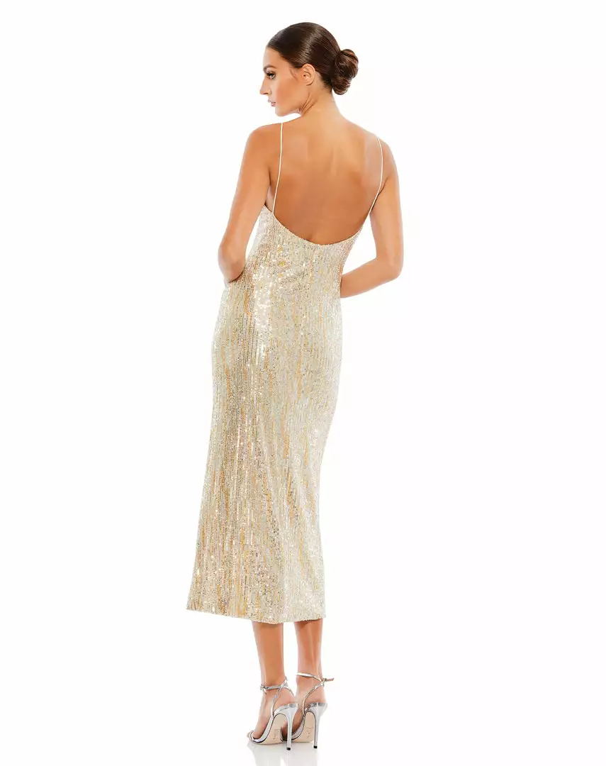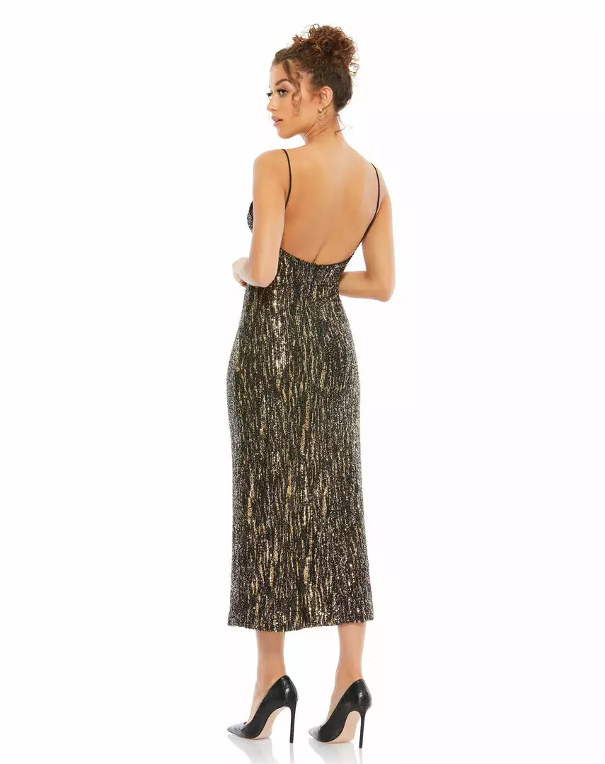 Sexy sequined midi dress with delicate straps, plunging v-neckline, and low back.