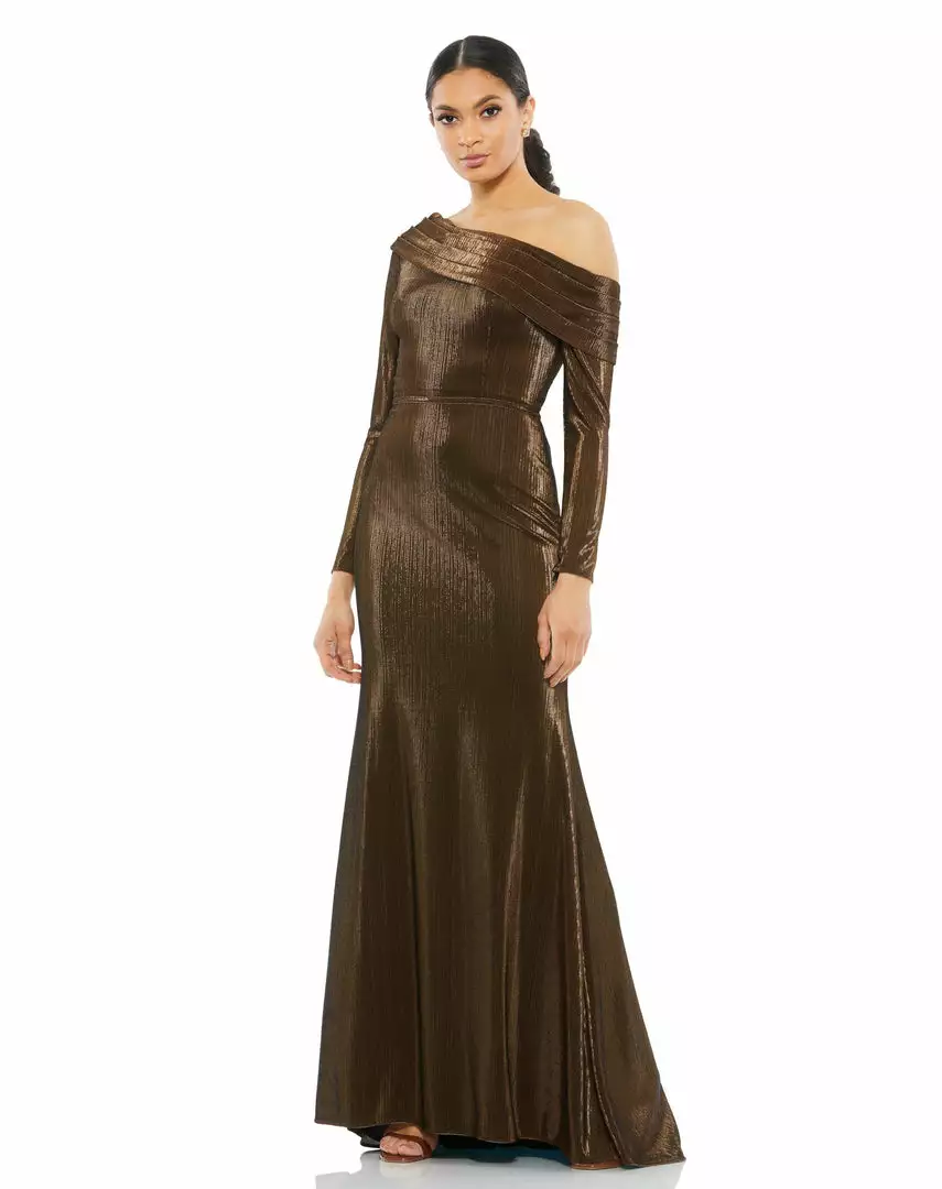 Ieena For Mac Duggal Shop For Textured Metallic Off-the-Shoulder Trumpet Gown