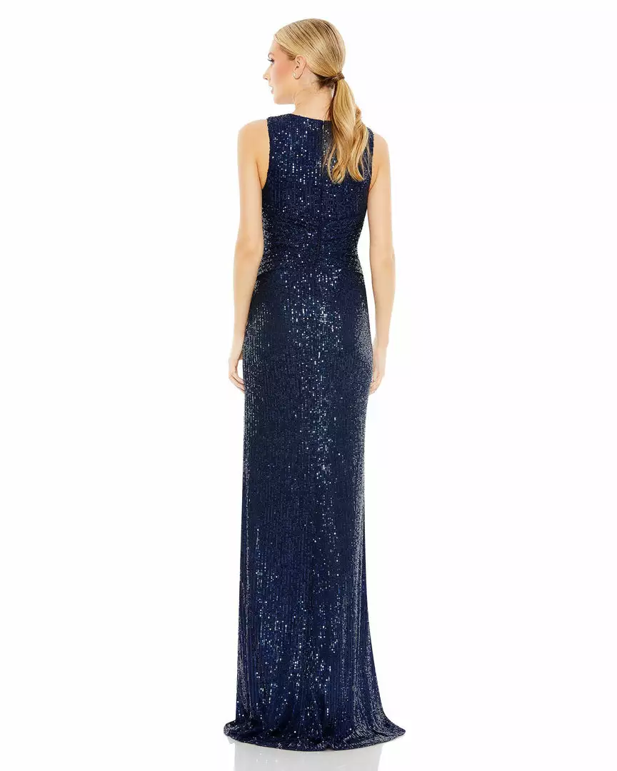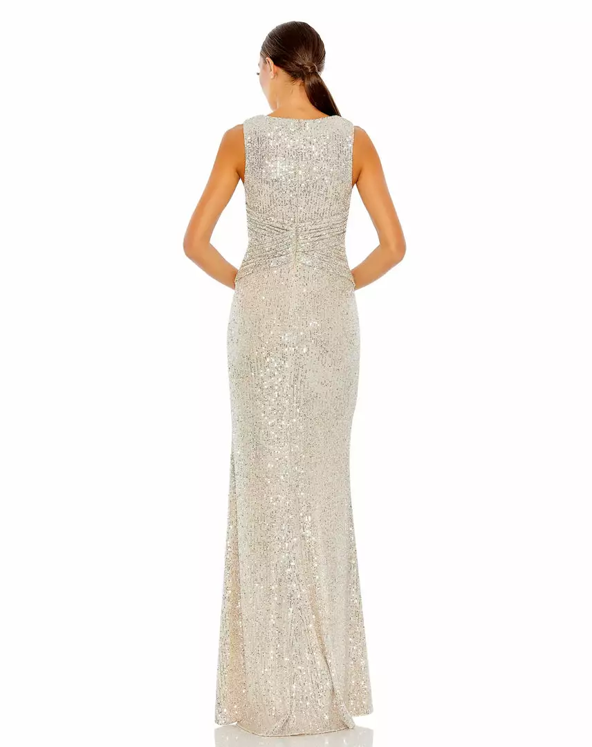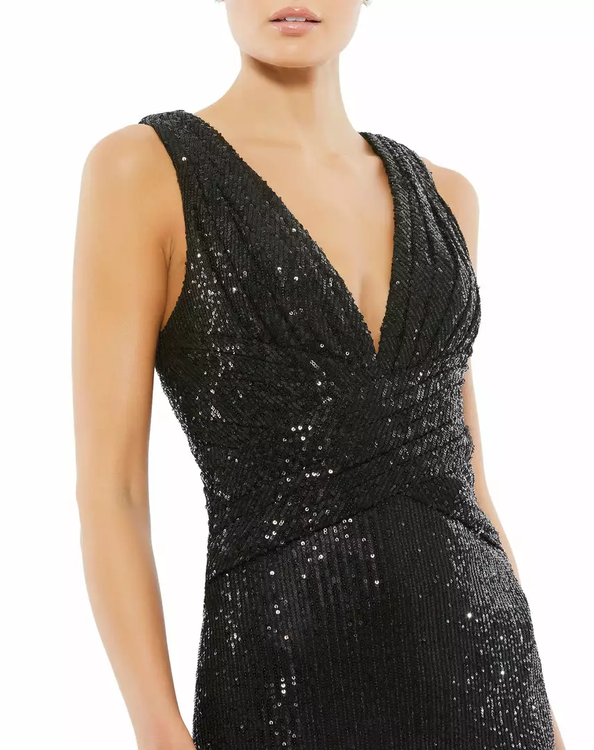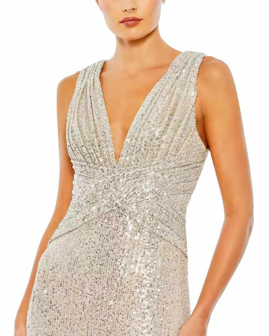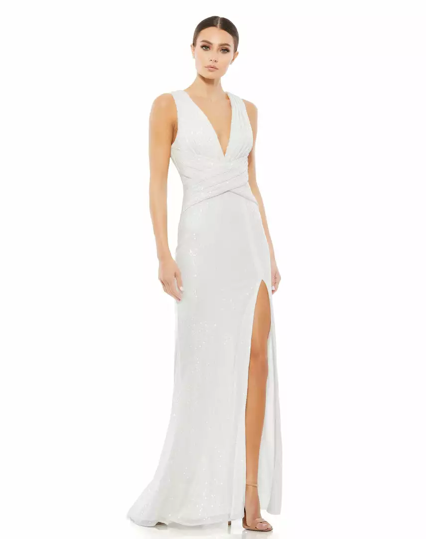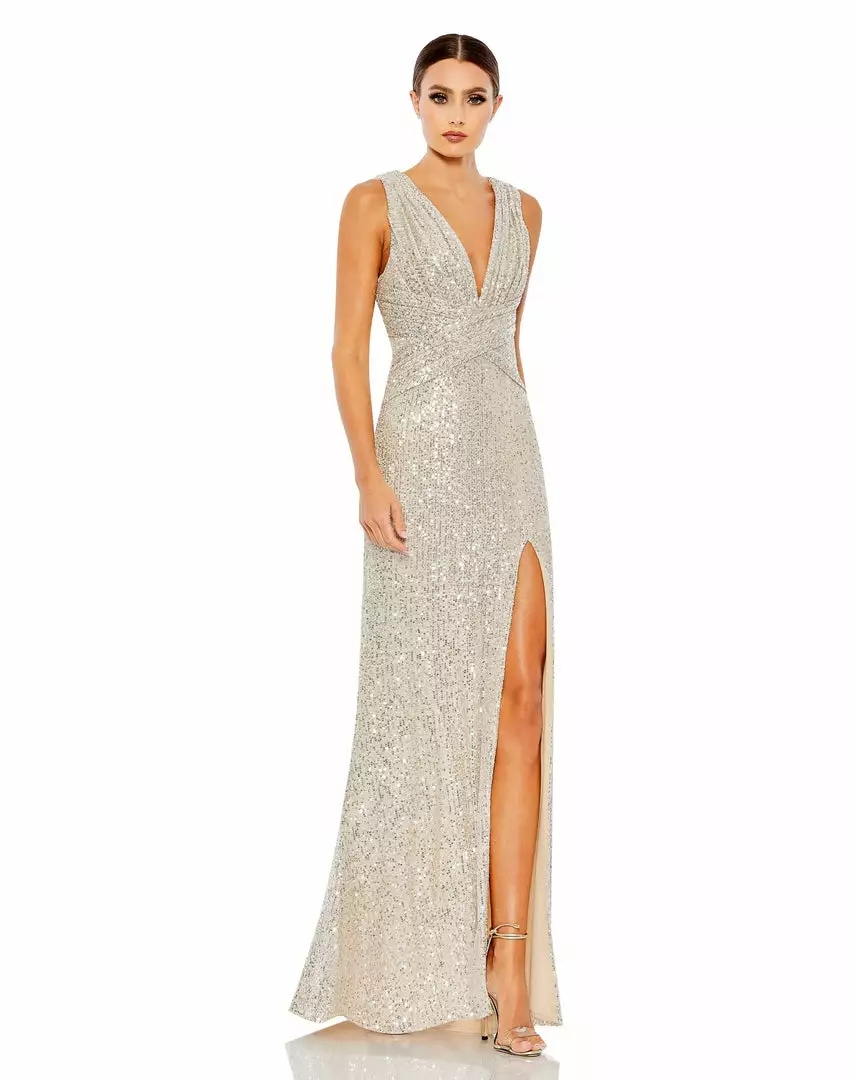 Floor-length sequined gown with a plunging v-neckline, wrap waist, and a thigh-high slit.