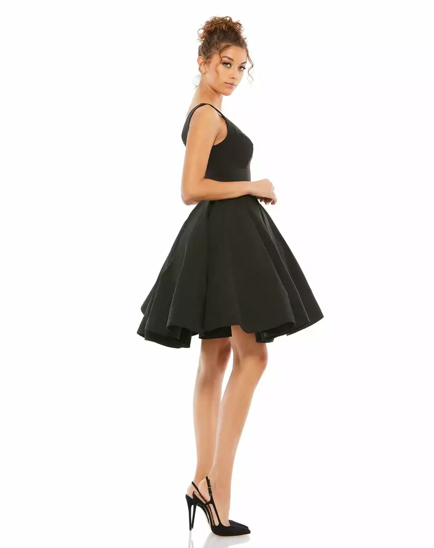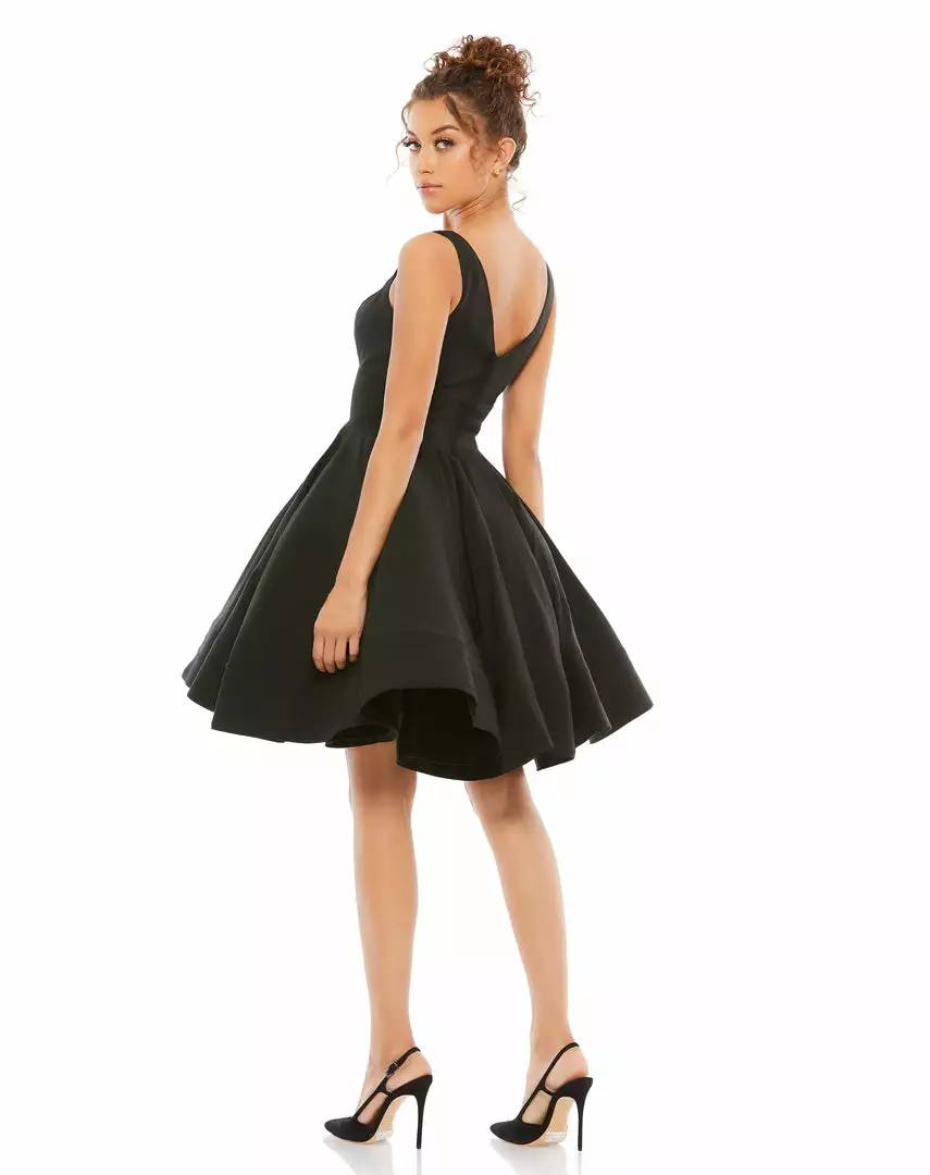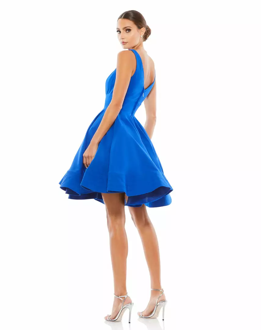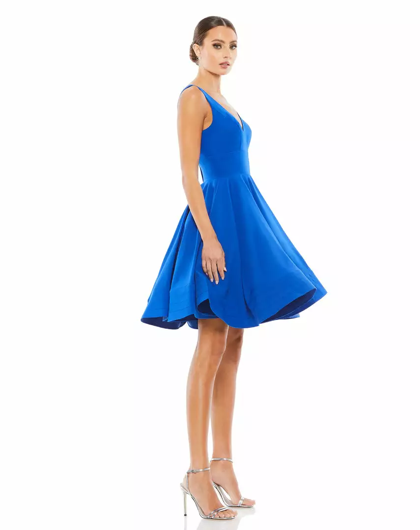 Perfectly tailored fit and flare dress, finished with a deep v-neck and pockets.