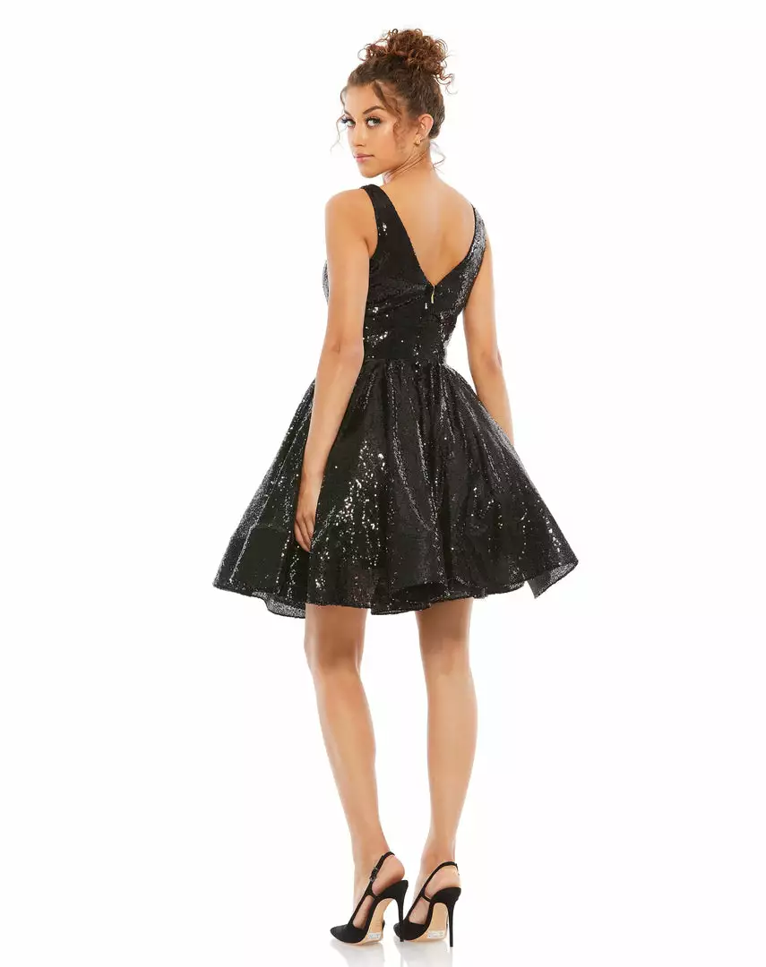 Ieena For Mac Duggal Pleated V Neck Tiered Ruffle Mini Dress
