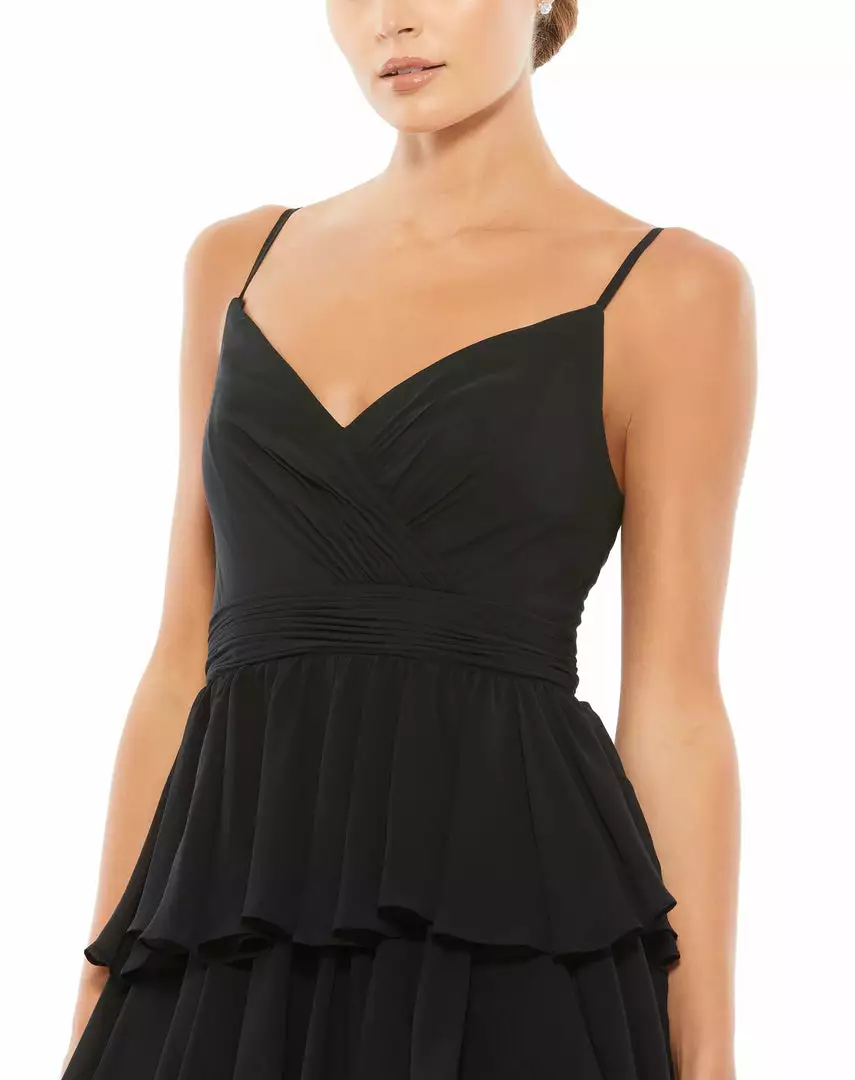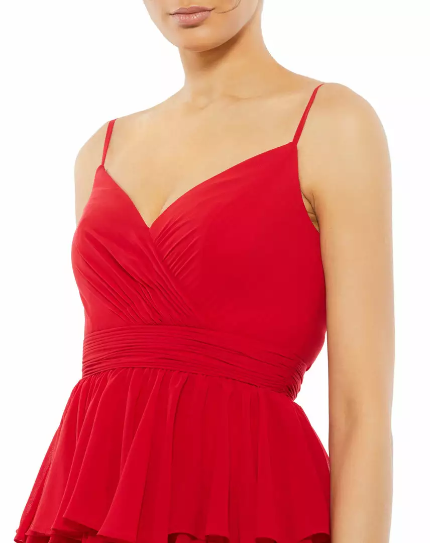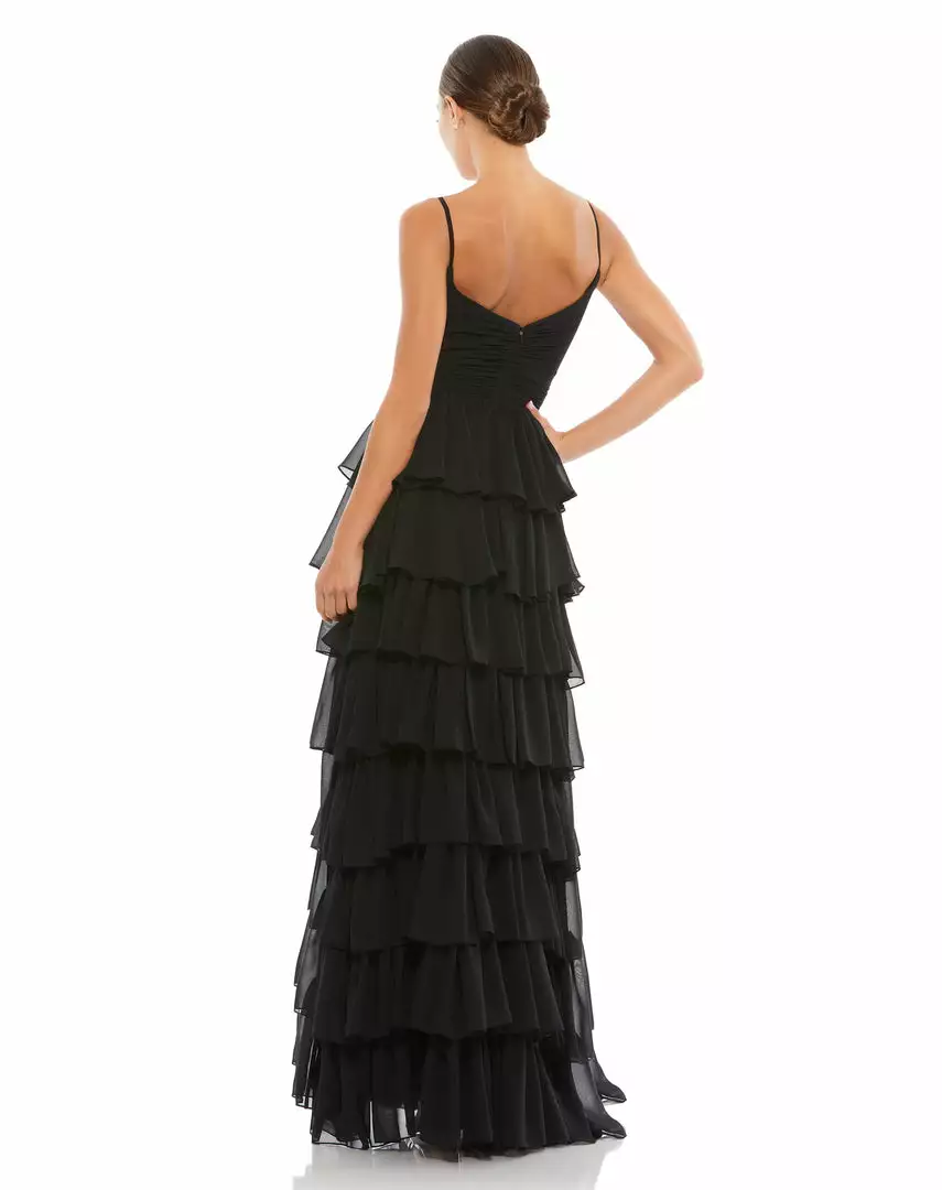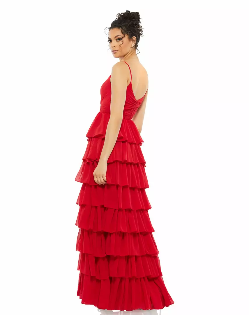 Sleeveless, v-neck gown with a ruffled skirt and thigh high slit.