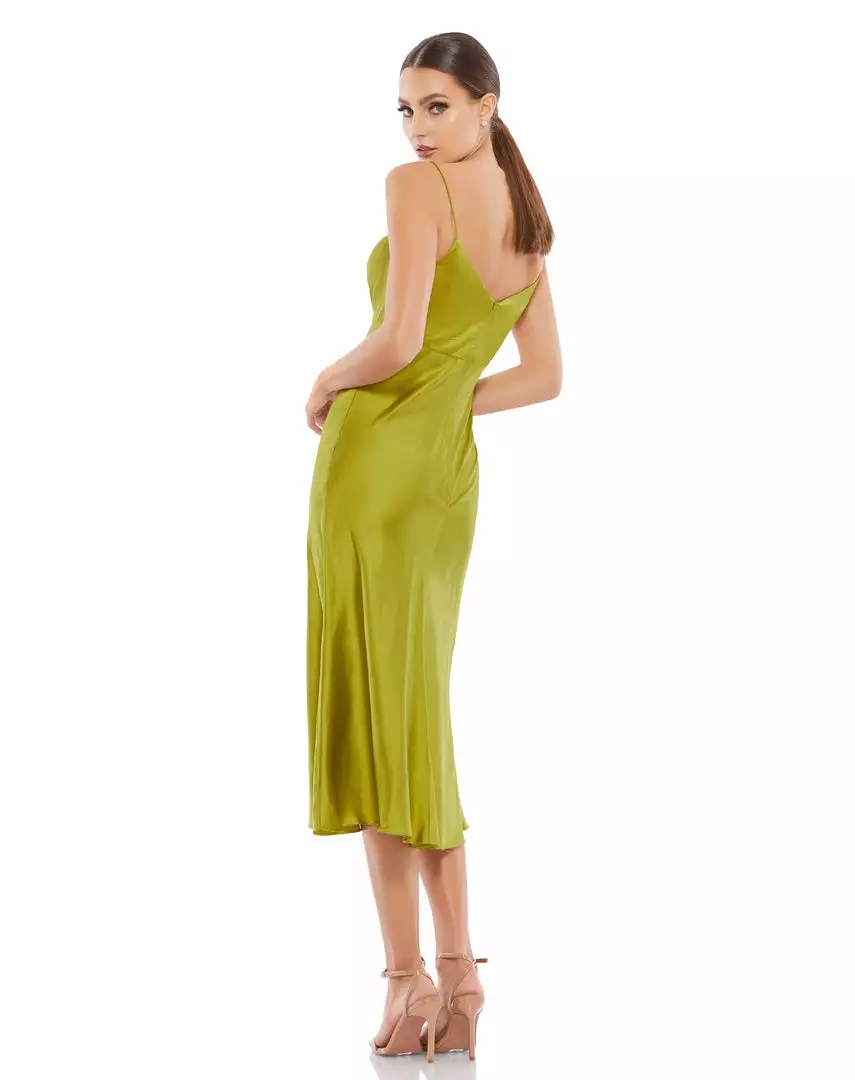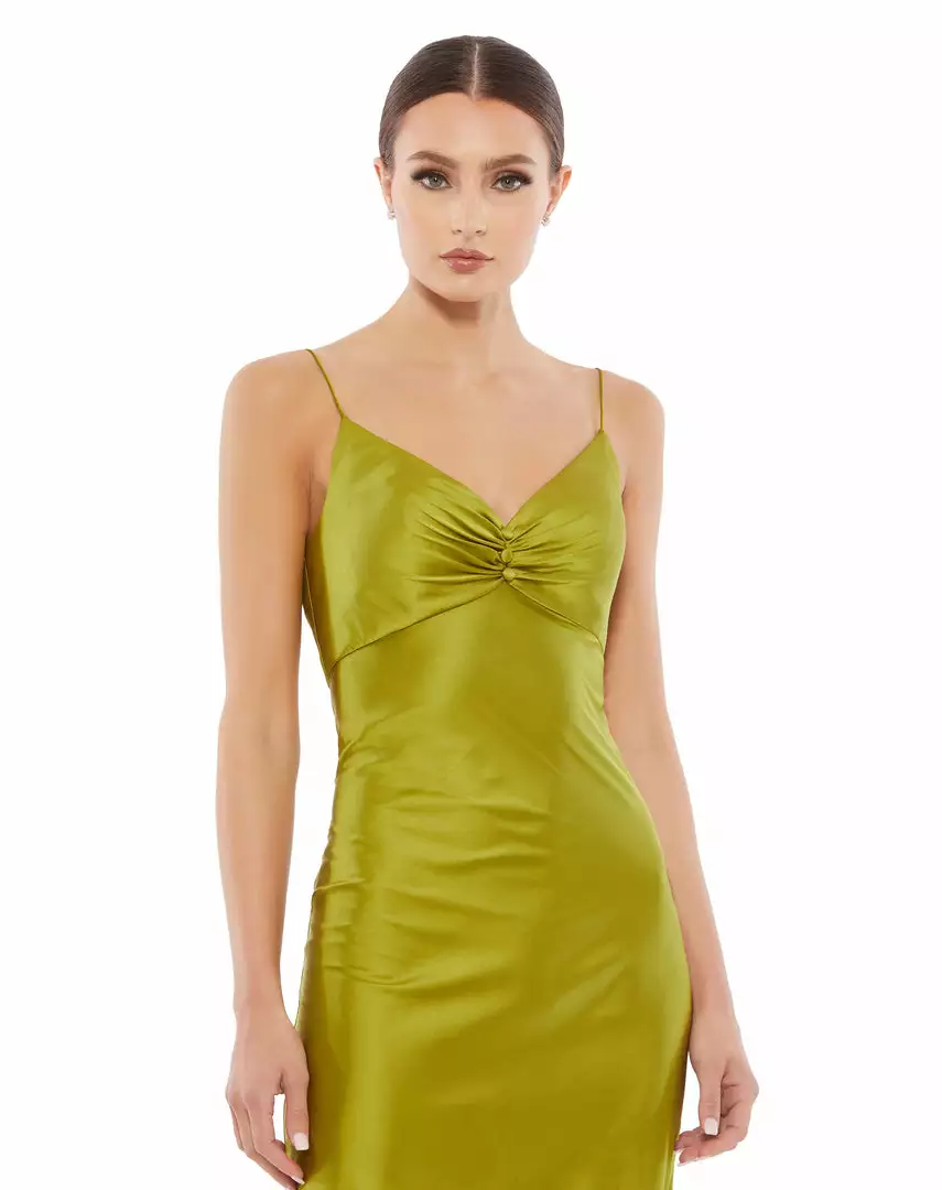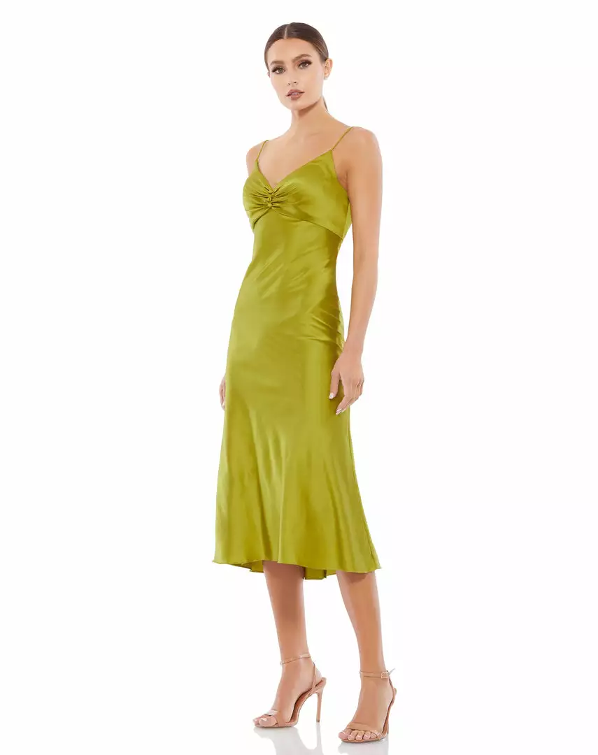 Slip dresses are back and prettier than ever. Made in liquid charmeuse, this silky dress has classic styling — slender straps and a midi hem — and fresh-twist details — an empire waist detailed with covered buttons and ruching. Ideal for year-round wear, the dress lends itself to summer weather with minimalist sandals and to cooler temperatures with a faux fur shrug and pumps.