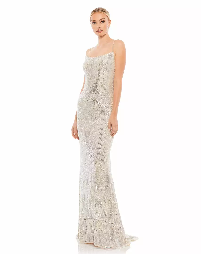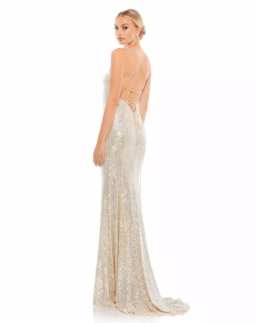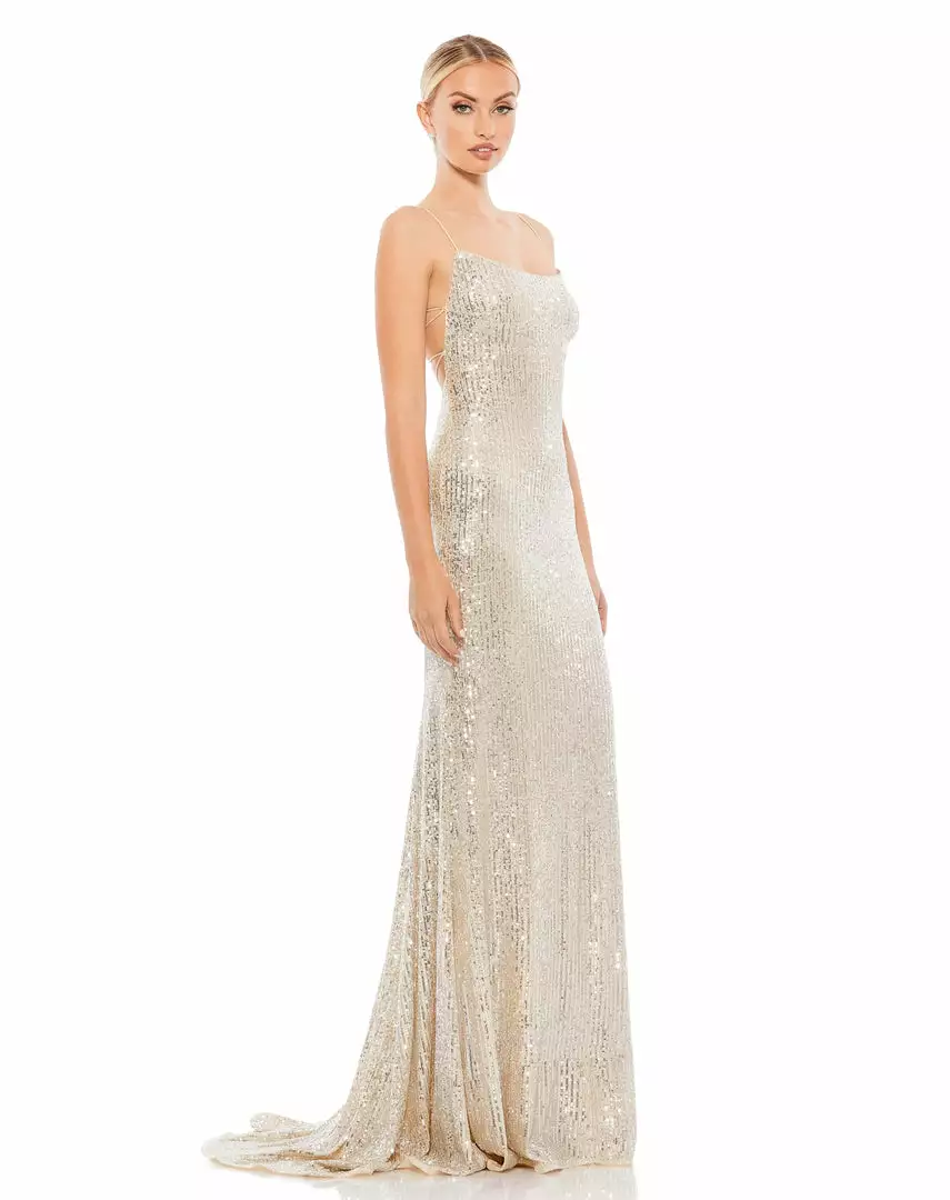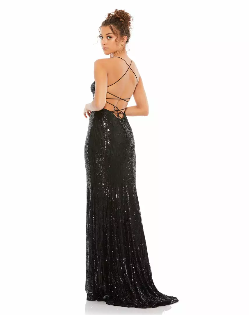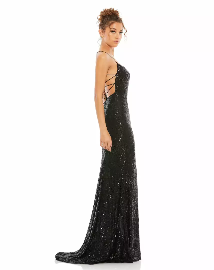 Sexy stretch sequin column gown with thin spaghetti straps, a strappy lace-up back, and a sweeping train.