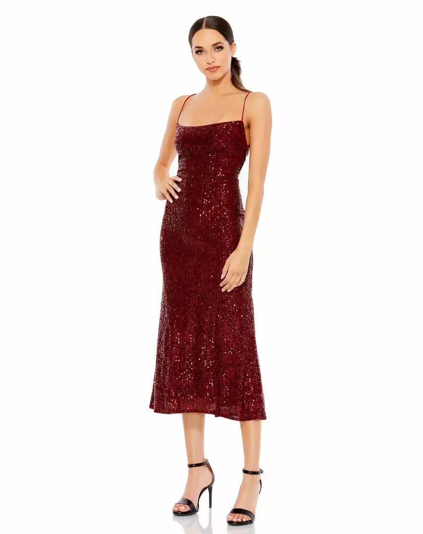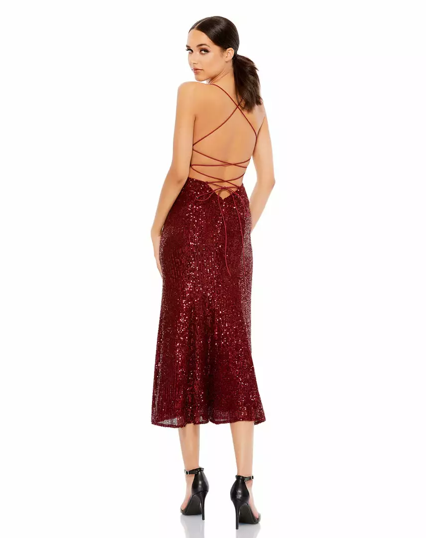 Sexy stretch sequin midi dress with an open lace up back.