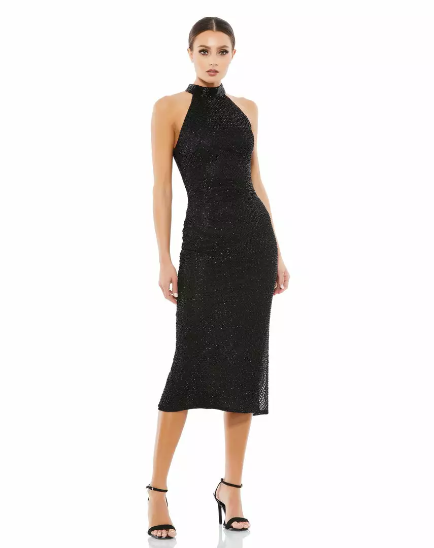 Chic high-neck halter midi dress with diamond-patterned beading throughout the overlay. This midi sheath dress features a back zipper and back center slit.