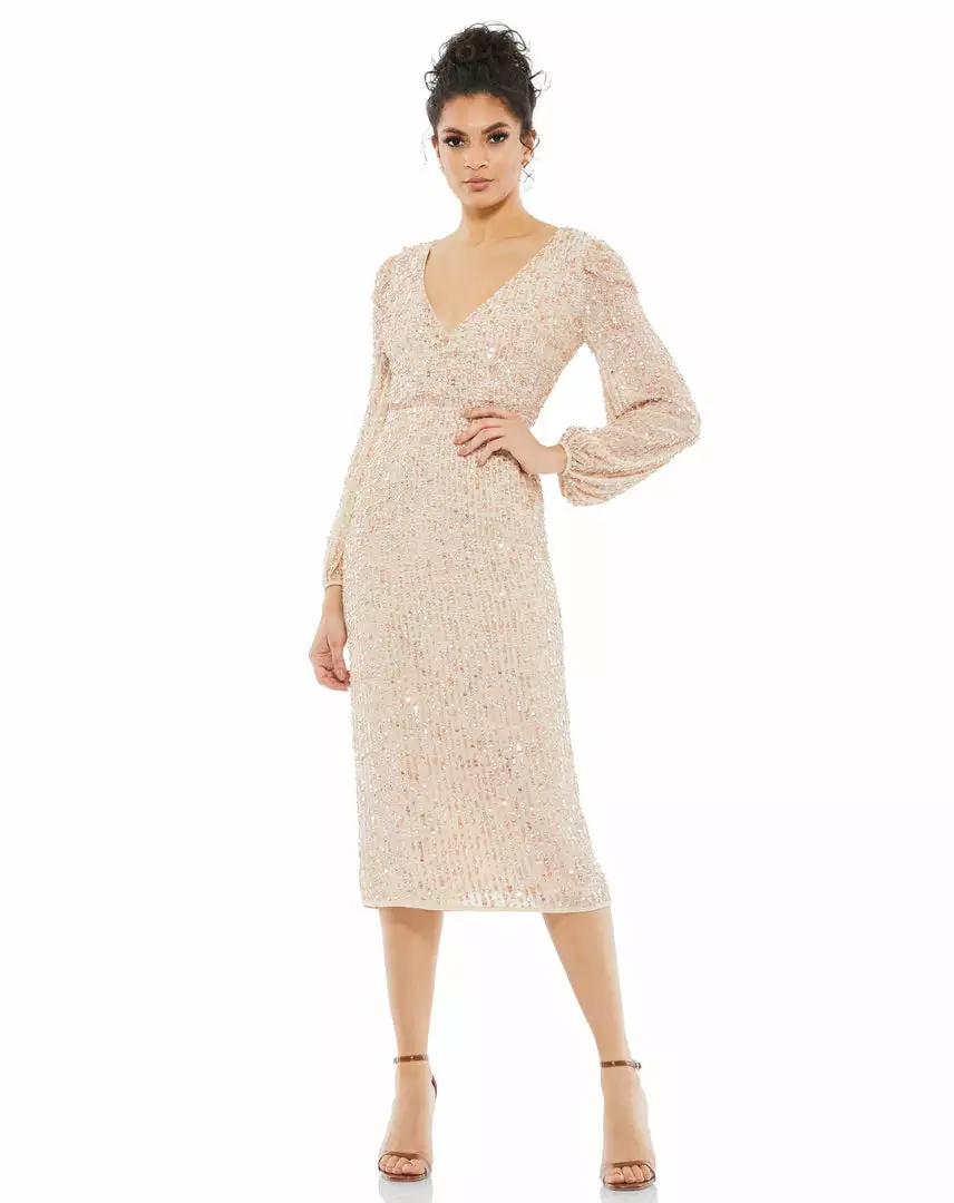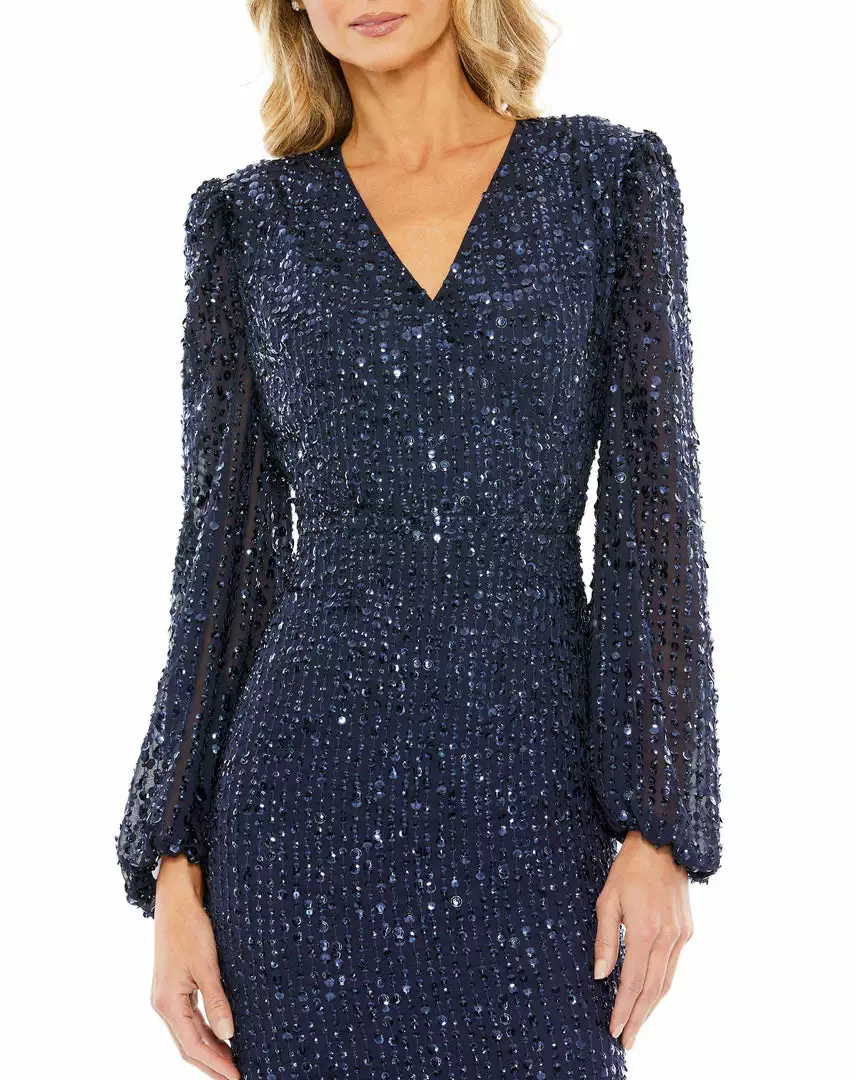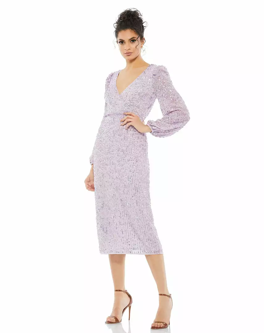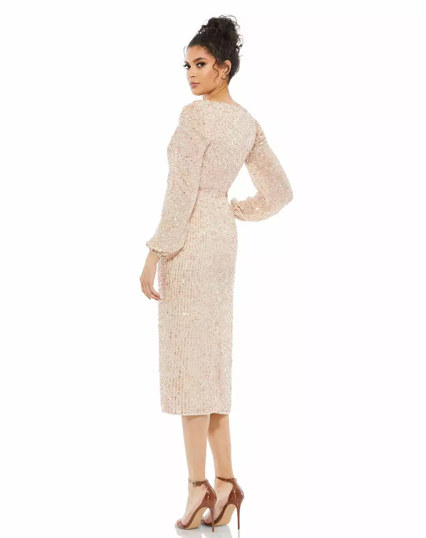 Sequined surplice cocktail dress with a faux-wrap v-neckline, long puff-shoulder blouson sleeves, and a chic midi-length skirt with a center back vent slit.